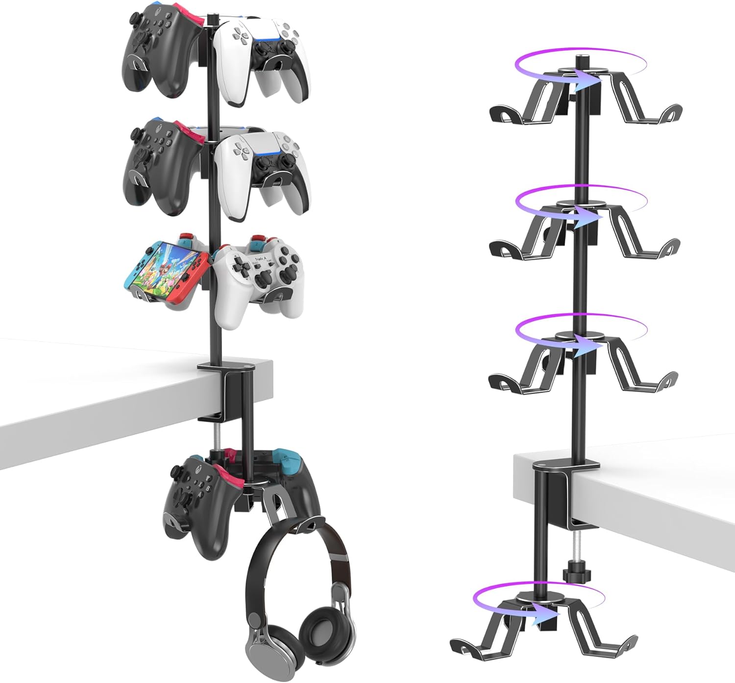 Rotatable 4 Tier Desk Clamp Controller Headset Stand, Universal Under Desk Controller Holder Rack for PS5 Xbox Nintendo Switch PC PS4, Aluminum Gaming Headphone Hanger, Black