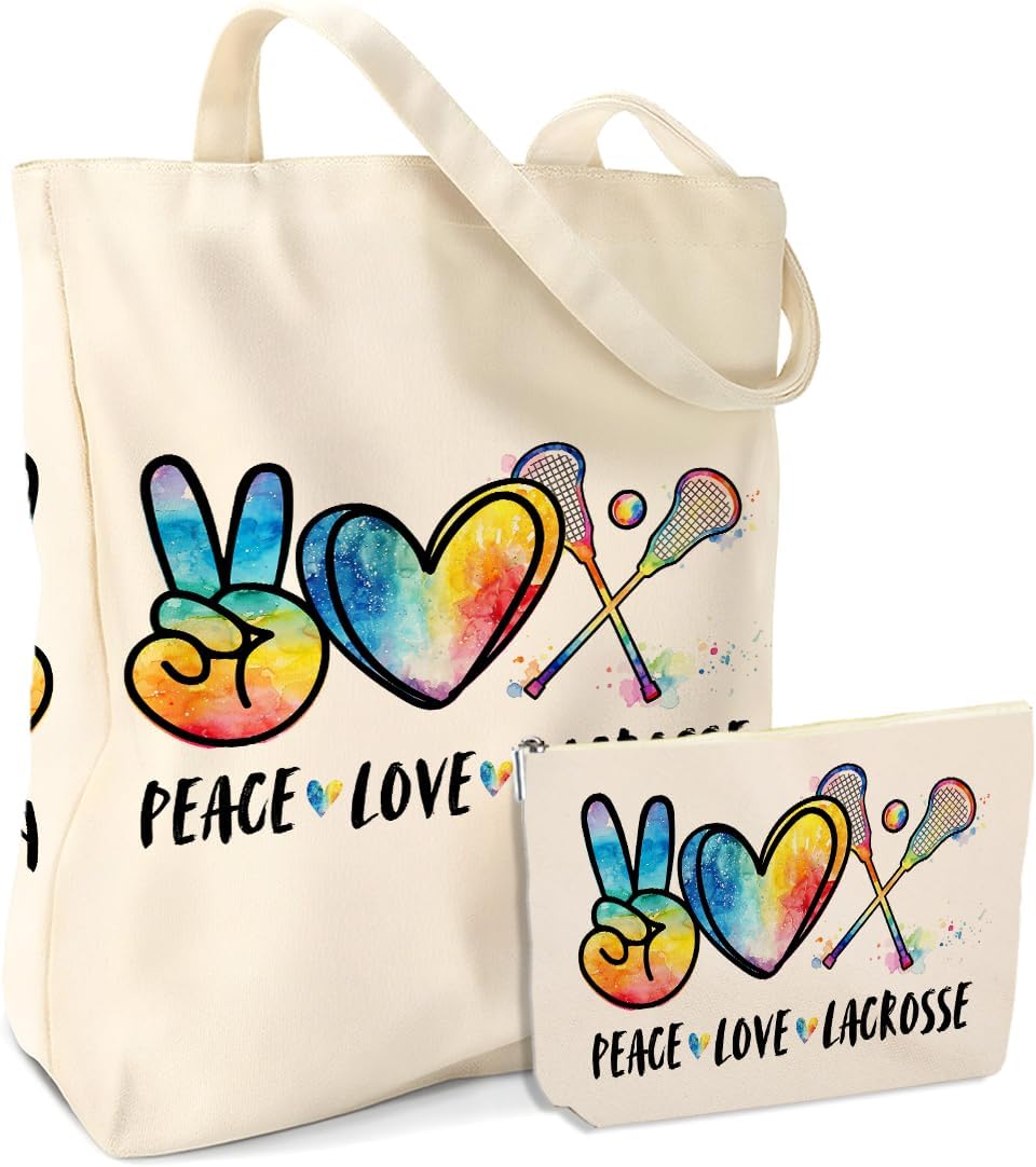 Lacrosse Gifts for Lacrosse Moms Sports Players Team Friend Niece Sister Girls Bestie Coworker Birthday Christmas Friendship 2PCS Cosmetic Bags Canvas Tote Bag Beach Bag with Pocket Makeup Bags