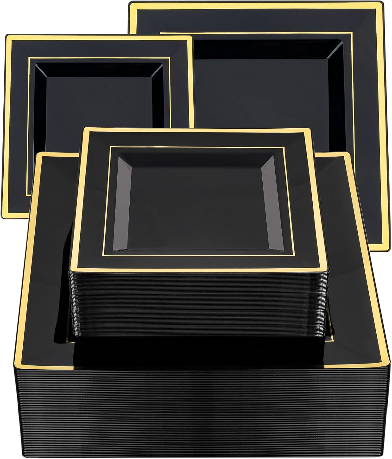 Goodluck 100 Black Pack Square Plastic Plates With Gold Rim, Heavy Duty 50 Dinner Plates 9.5" and 50 Dessert Plates 6.5", Fancy Disposable Plates for Wedding, Holiday Party, Birthday, Halloween