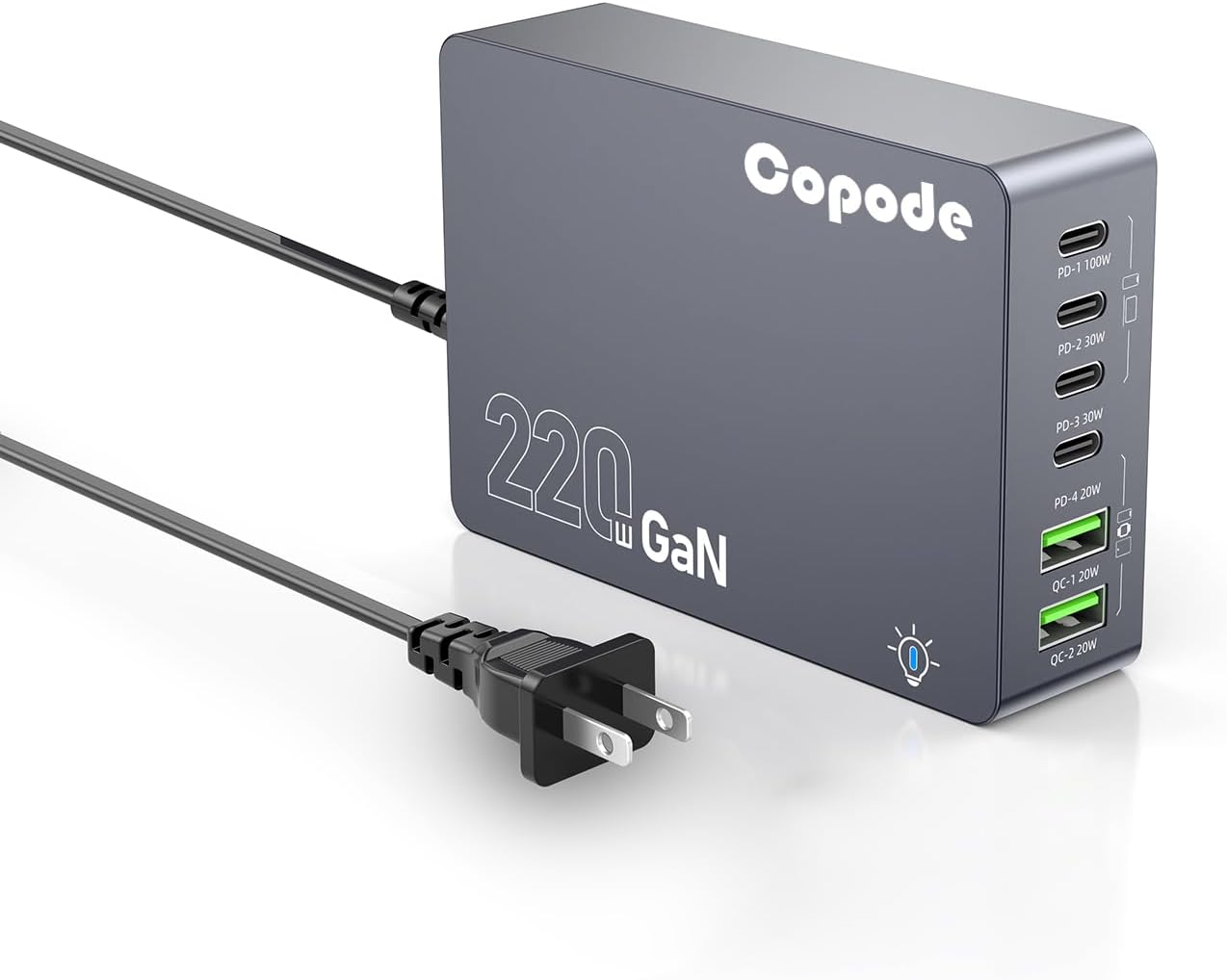 - Special Feature: 220W charger Bolck Travel, 6port Fast Charging, GaN Technology charger, Lightweight Design, Multiple Device Charging