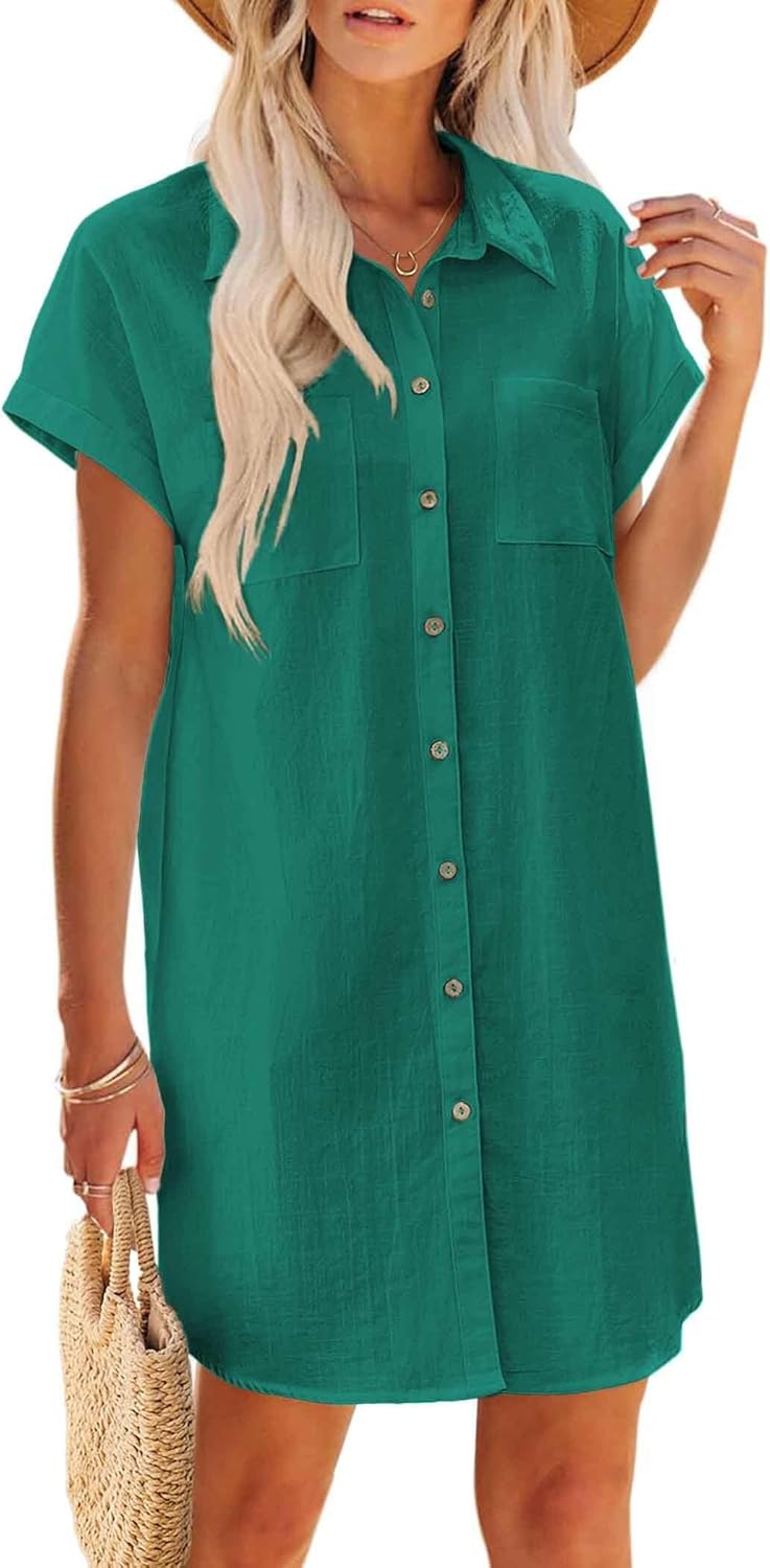 Zeagoo Summer Dresses for Women Casual Loose Fit Short Sleeve Cotton Linen Dress Vneck Button Down Tshirt Dresses Beach Vacation Mini Sundress GreenL