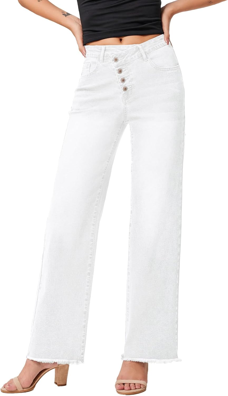 Sidefeel Women's Wide Leg Jeans High Waisted Stretchy Baggy Diagonal Waist Raw Hem Denim Pants