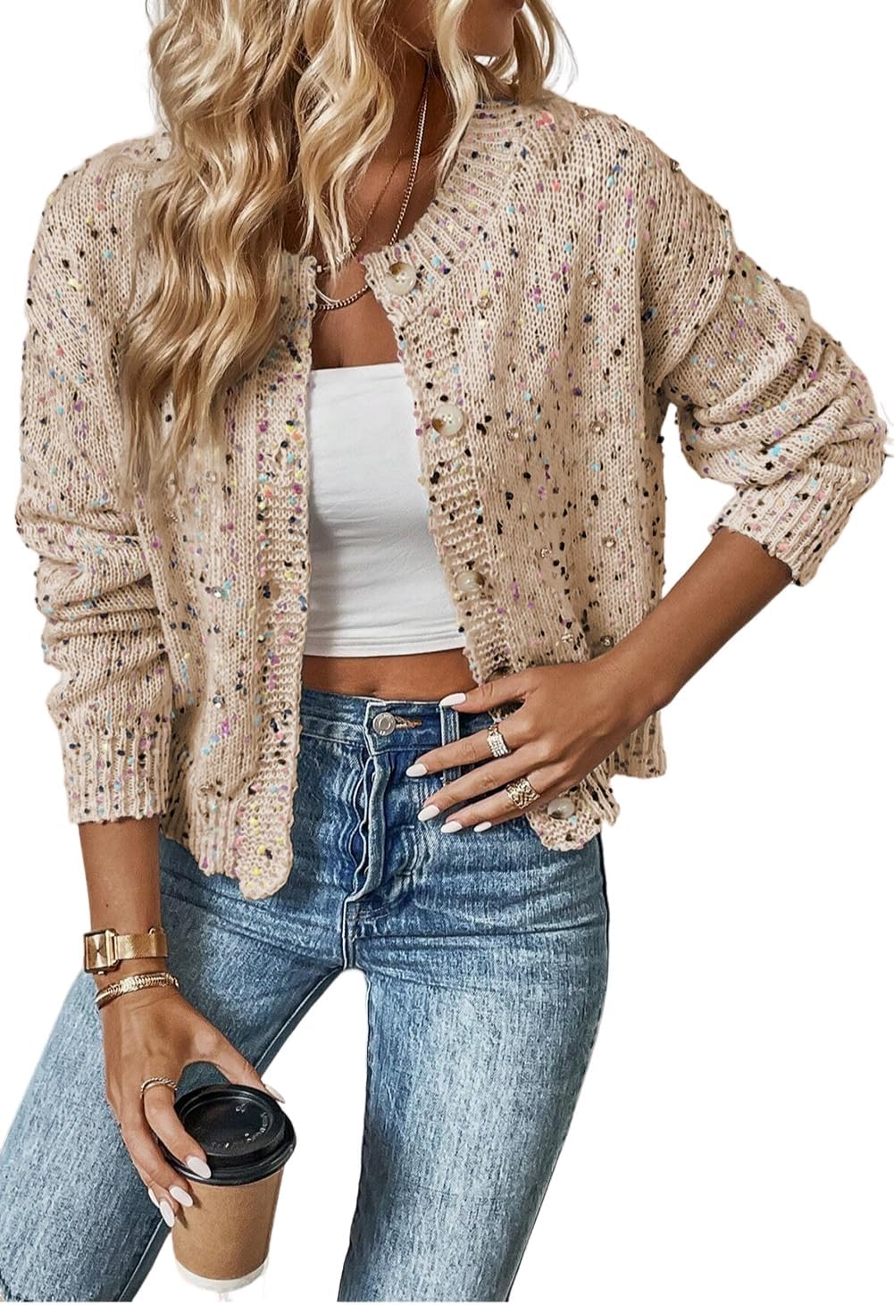 SELINK Women's Cardigan Sweater Elegant Rhinestone Decor Multicolor Confetti Sweater Cardigan Solid Long Sleeve Outwear