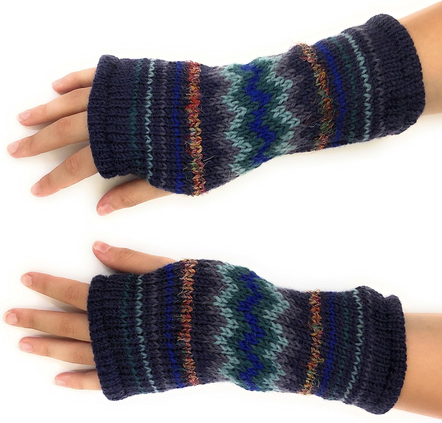 Hand Knit Fingerless Winter Striped Texting Gloves Warm Wool Fleece Lined