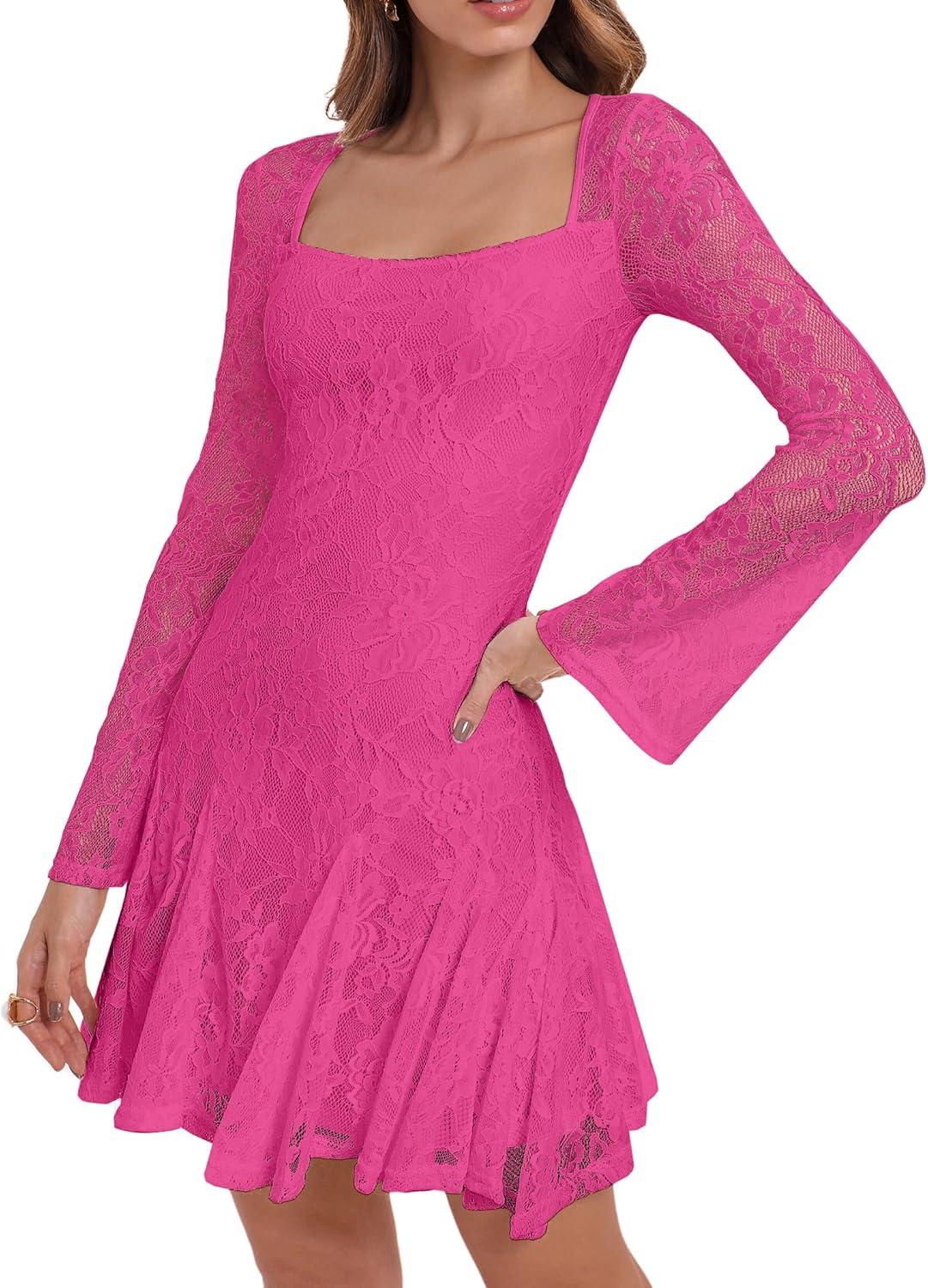 HYPERFIRE Women's Square Neck Floral Lace Mini Dress Flowy Short Dress Mesh Night Out Dresses Club Outfit
