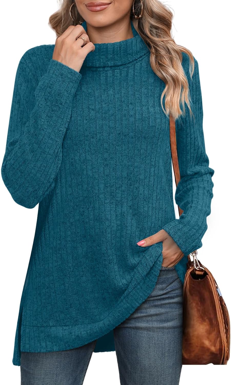 WIHOLL Womens Tunic Tops Turtleneck Long Sleeve Shirts Oversized Fall Sweaters Side Split High Low Hemline