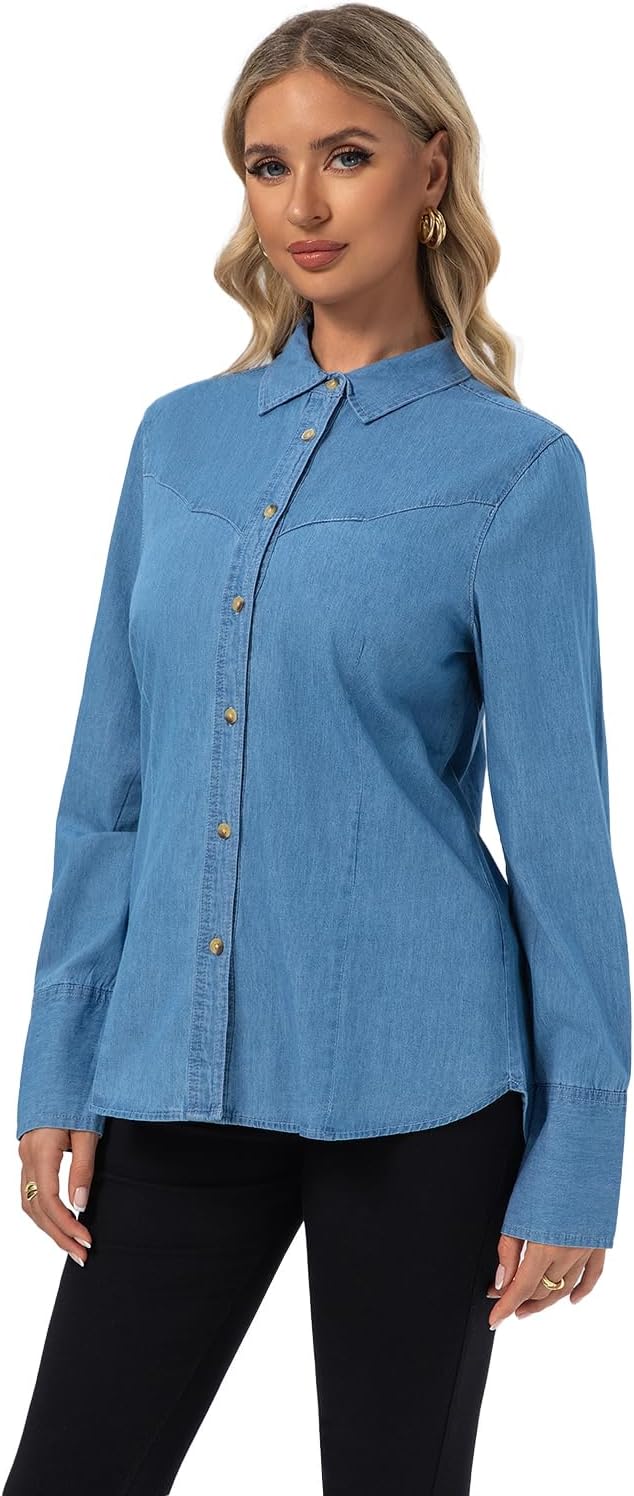 FASHIONSPARK Women's Long Sleeve Denim Button-Down Shirt - Casual Lightweight Lapel Top for Everyday & Travel