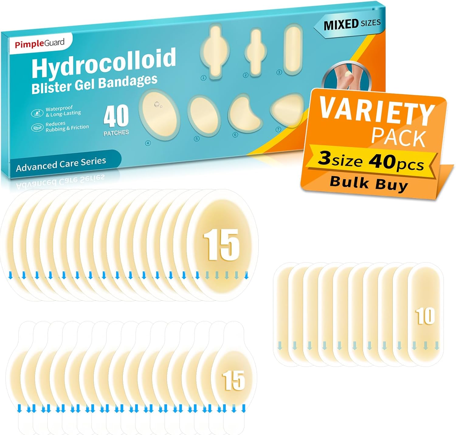 40ct Blister Bandages for Feet Hydrocolloid Bandages Waterproof Blister Cushion for Feet Toes Heels Blister Pads for Prevention Variety Pack