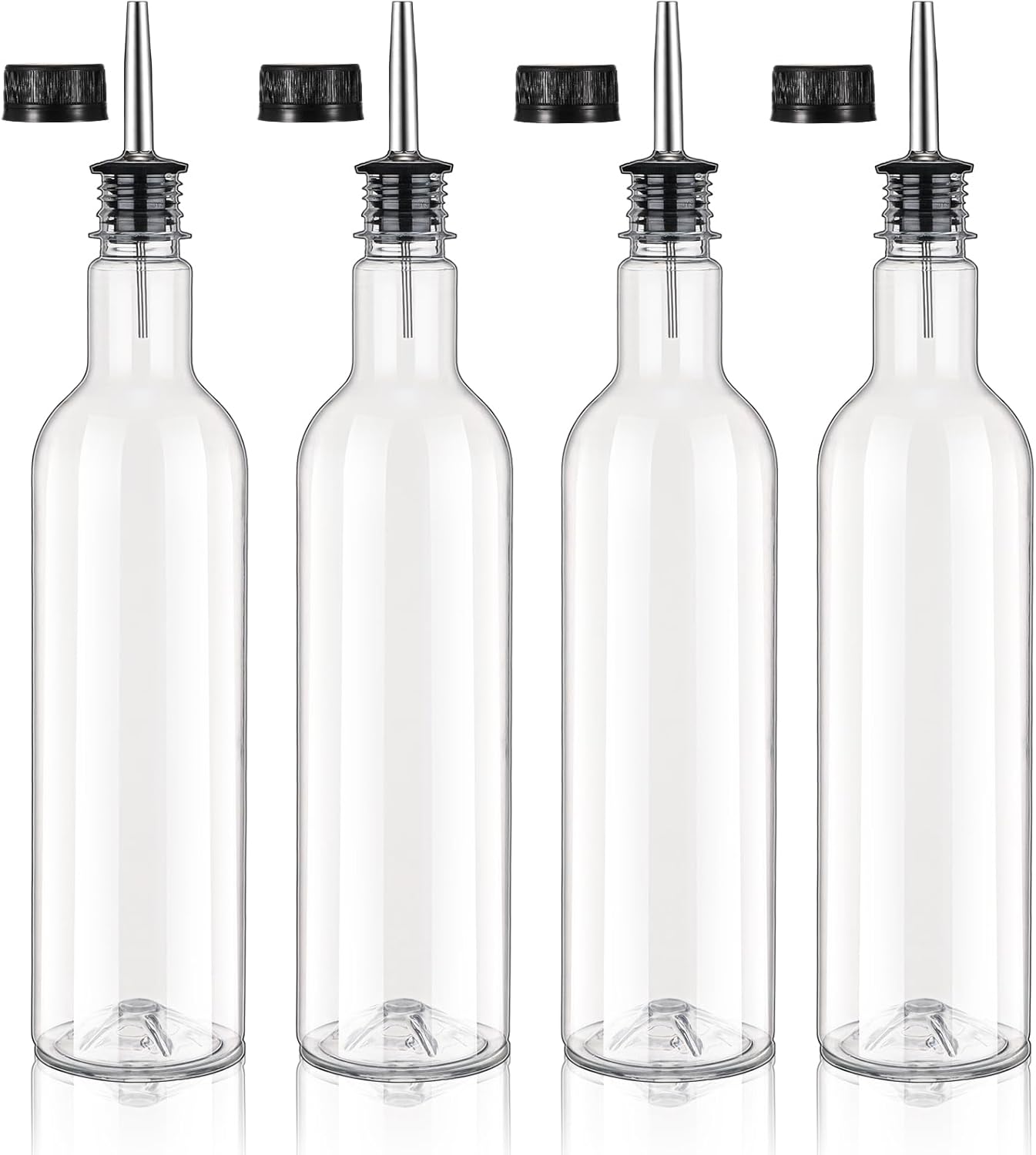 25 oz Plastic Long Neck Bottle with Stainless Steel Leakproof Tapered Spout Pourer and Cap Syrup Alcohol Juice Coffee Liquor Container for Home Bar Service Bartending Party Supplies(4 Pack)