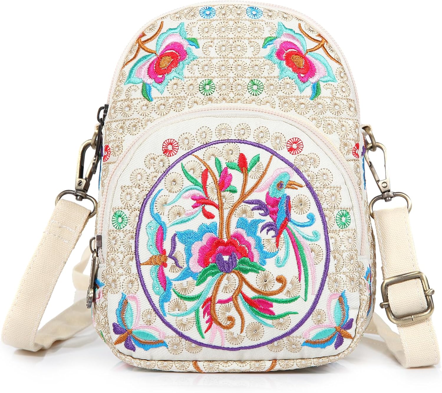 Embroidery Flowers Canvas Crossbody Bag, Women Messenger Bag, Cellphone Pouch Purse