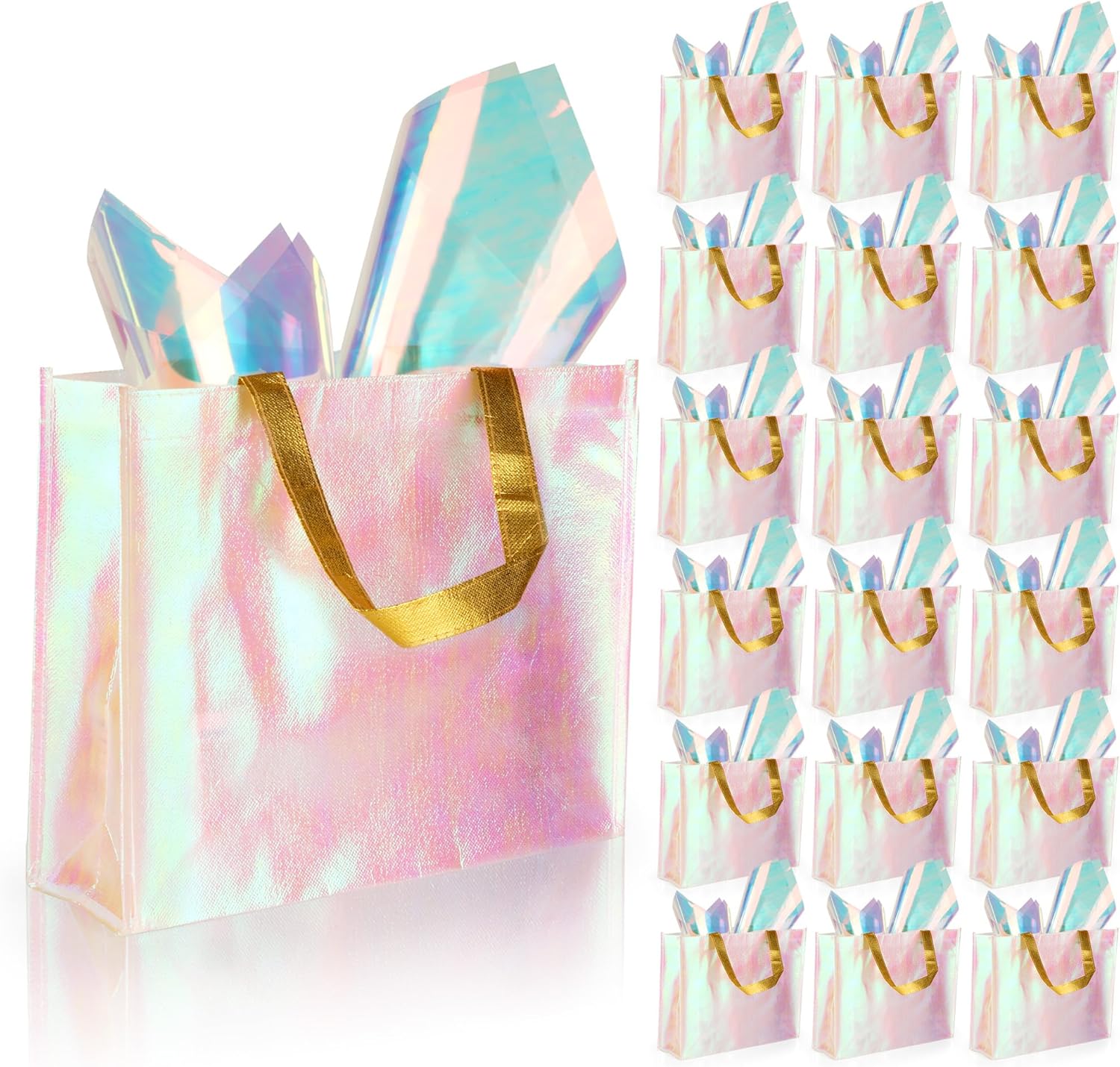 - [ Featuring holographic tissues ]: You will get 20 pack large size iridescent gift bags with handles,corresponding quantity of holographic tissue paper.Adequate quantity to provide ample supply for various events, parties, and gatherings