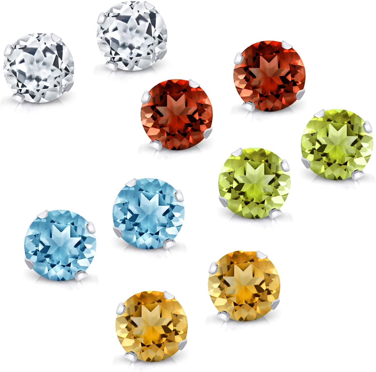 Gem Stone King 925 Sterling Silver Set of 5 Round 4MM Gemstone Stud Earrings - Blue and White Topaz Garnet Citrine Peridot - Sparkling and Elegant Jewelry For Women Men