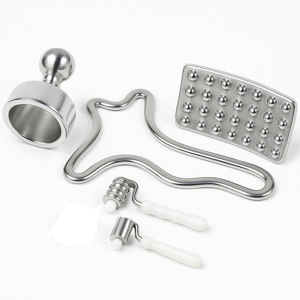 - Metal Tools: Includes Metal Swedish Cups, Metal Mushroom, Metal Contouring Board, Flat Metal Facial Roller, and Fluted Metal Facial Roller