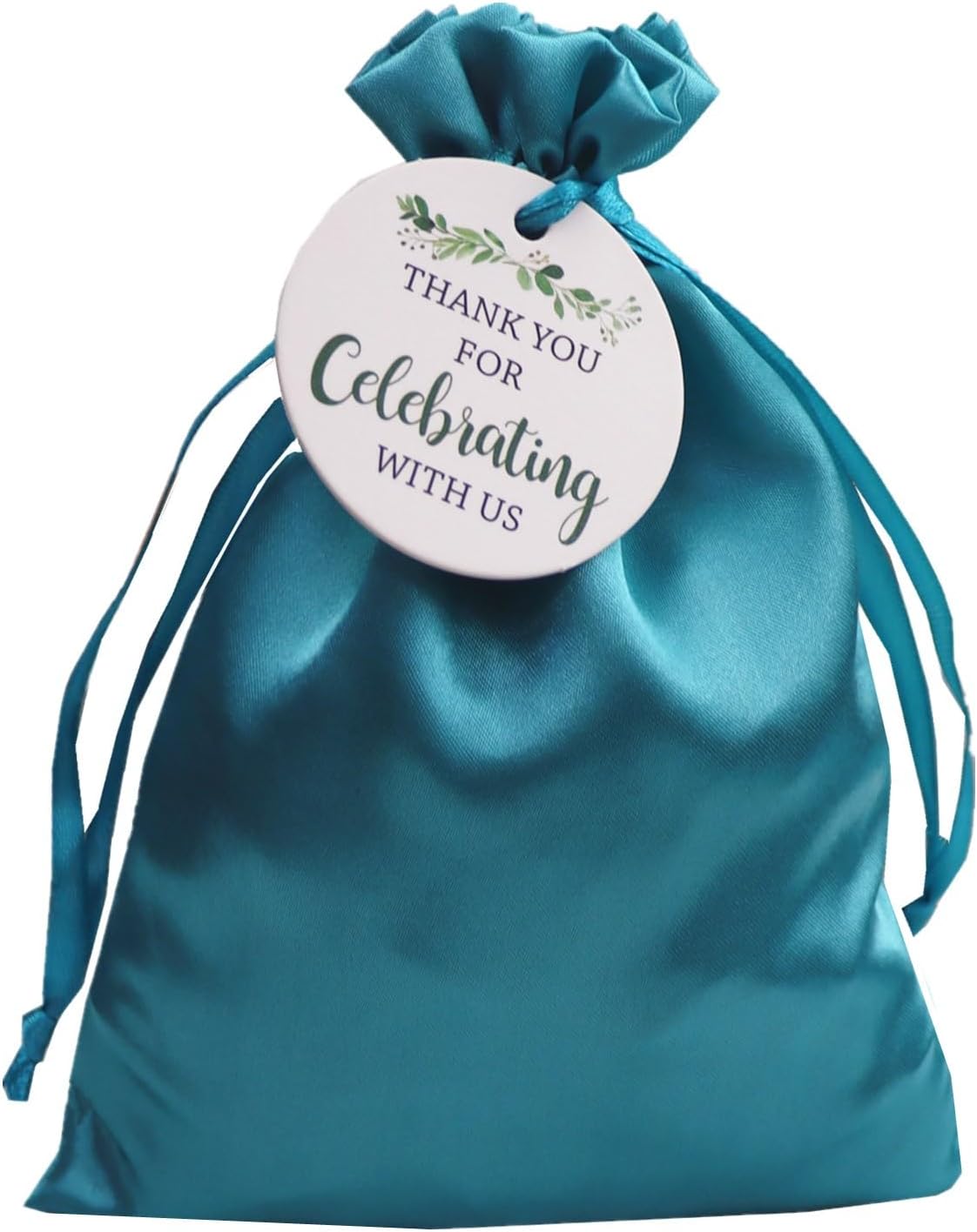 GUIFIER 30 Pack 5x7 Inch Satin Gift Bags, Teal Drawstring Bag with Tags, Silk Jewelry Pouches, Wedding, Graduation Favor Bag, Small Candy Pouch, Reusable Fabric Gift Bags for Baby Shower