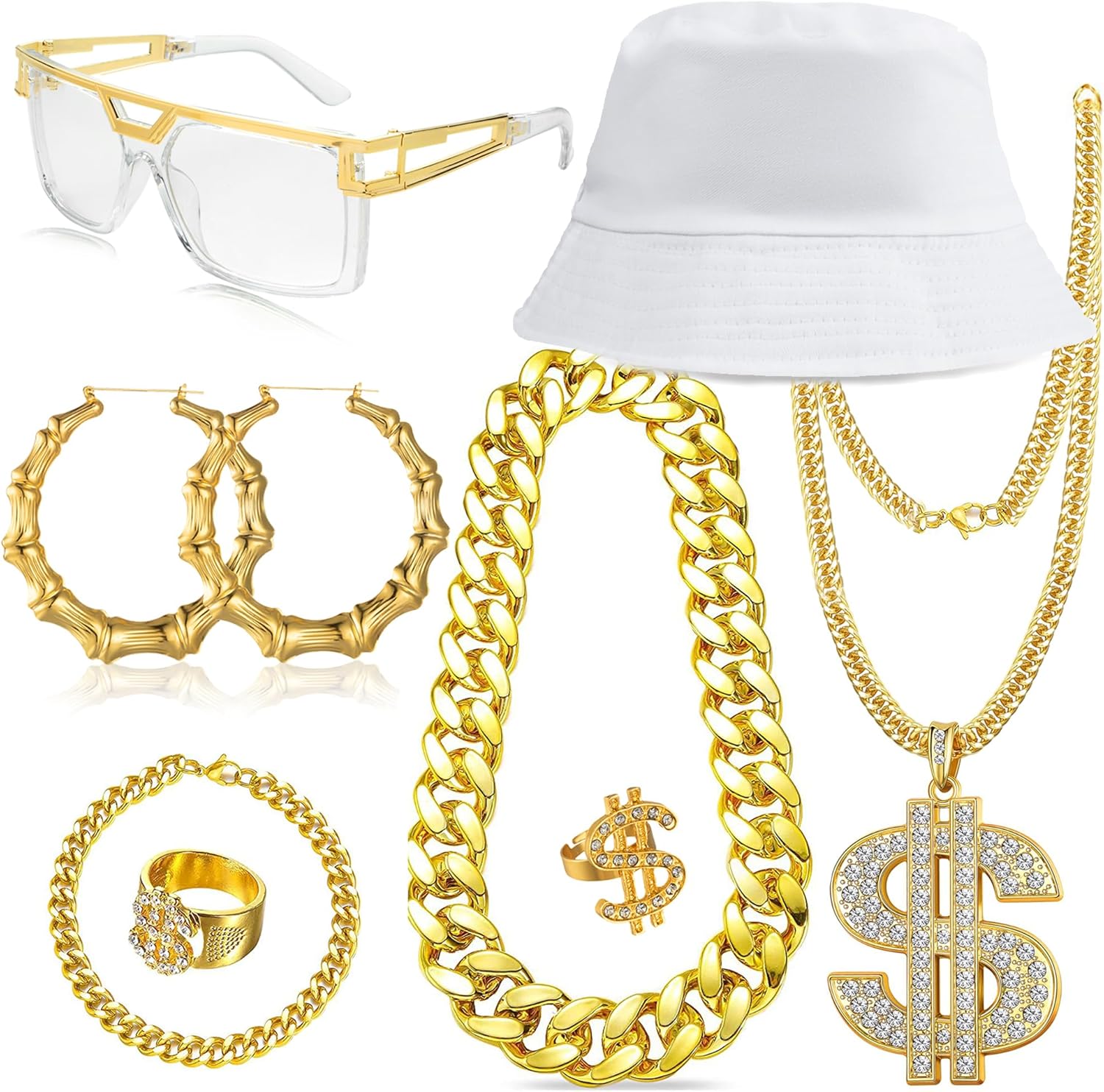 80 90s Accessories Outfit for Woman Hip Hop Costume Kit Old School Rapper Golden Chain Necklaec Big Hoops Jewelry