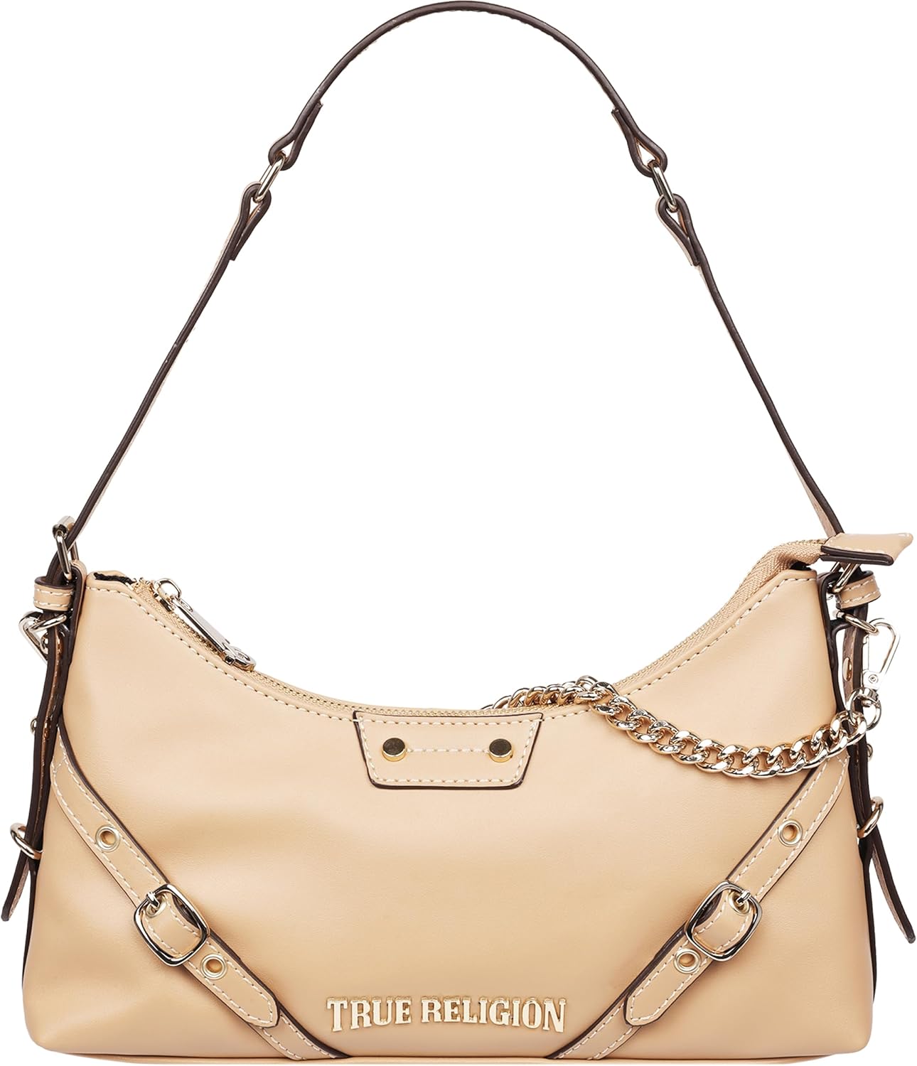 True Religion Shoulder Bag, Smooth Belted Purse with Chain Handle, Adjustable Strap and Gold Hardware