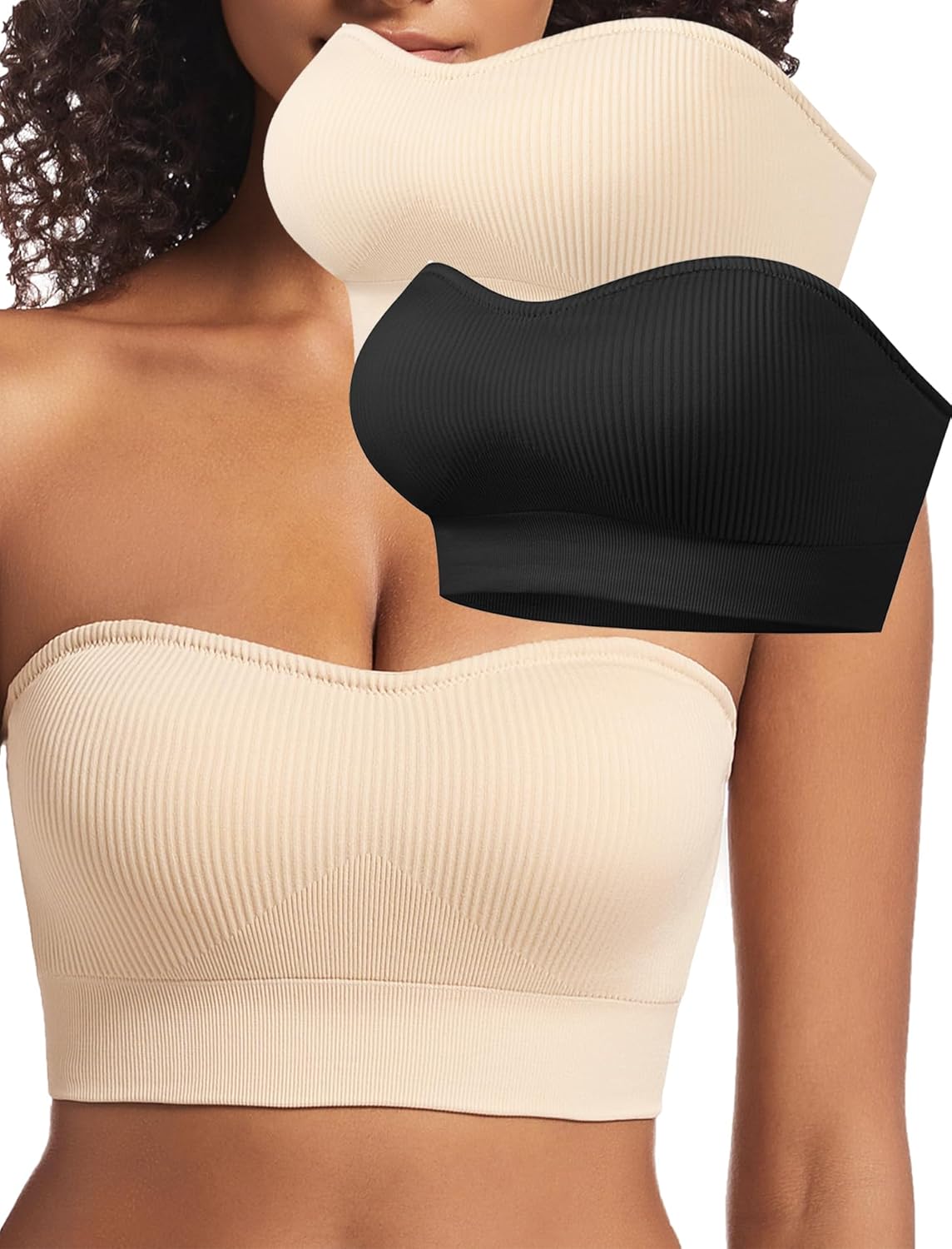 PRETTYWELL Strapless Bra for Women Ribbed Seamless Non-Slip Comfort Padded Wireless Bandeau Bras Wireless Tube Top Bra