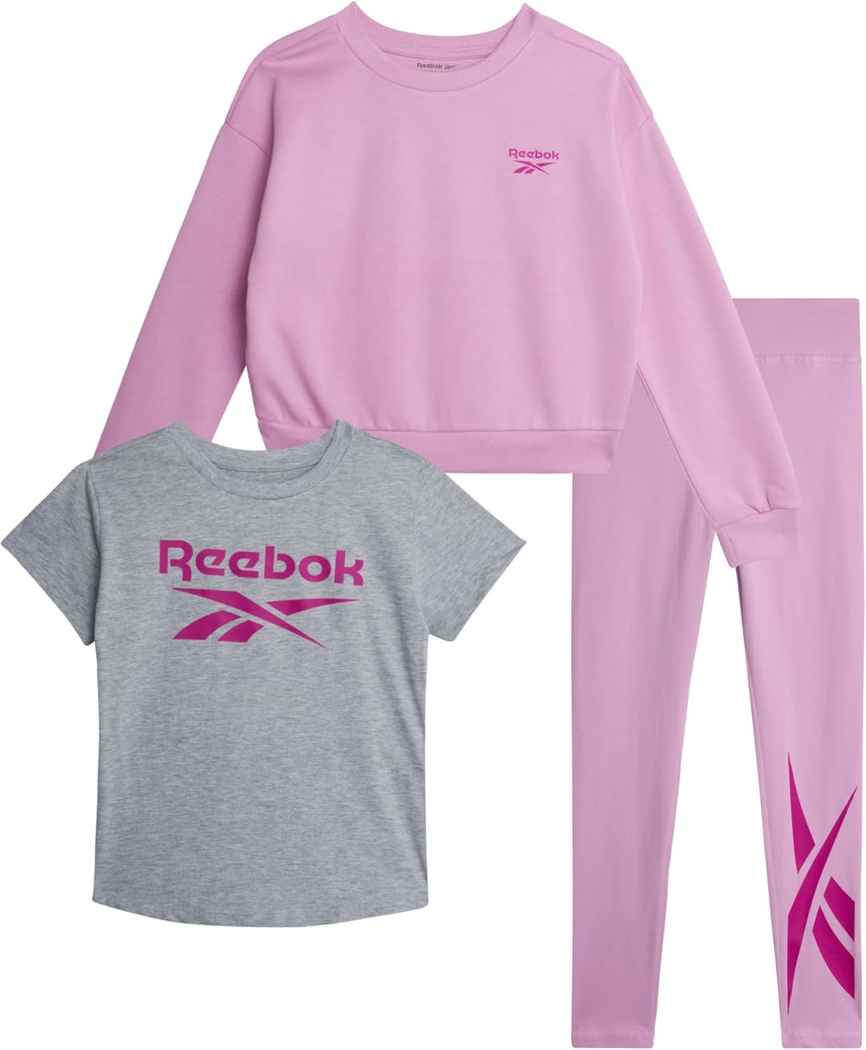 Reebok Active Girls Leggings Set - 3 Piece Athletic Crew Neck Short Sleeve TShirts Sweatshirt and Legging Pants for Girls