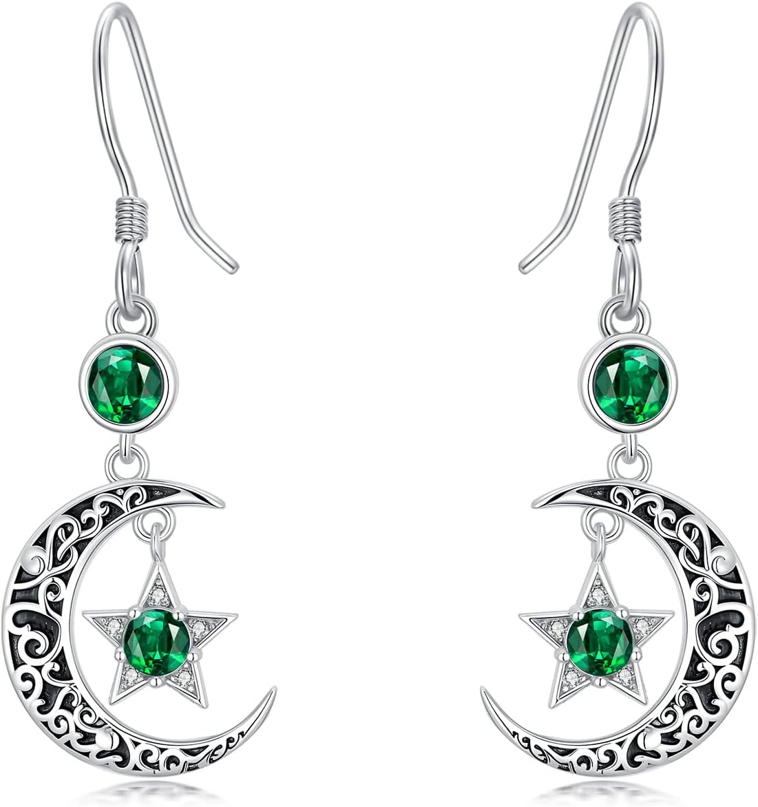 Seiyang Moon Star Birthstone Earrings 925 Sterling Silver Crescent Moon Star Dangle Drop Earrings with 12 Months Birthstone Vintage Jewelry Gifts for Women Mom Her