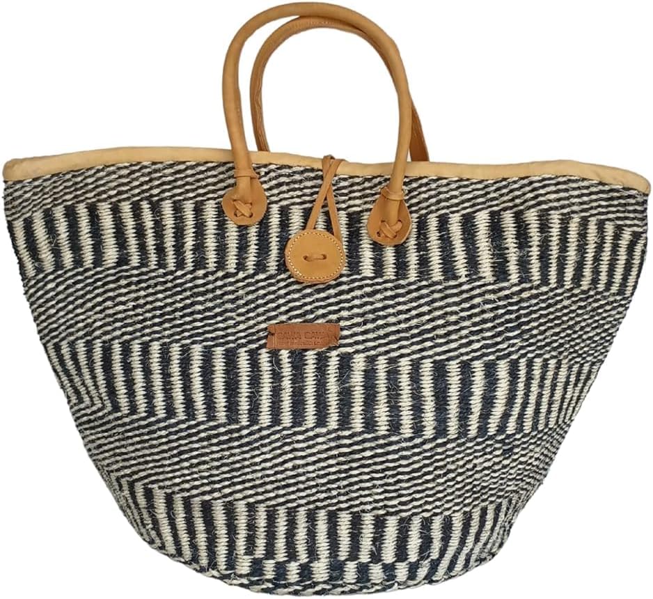 Balance Stripes Handwoven Economical Sisal Tote Bag, Market Grocery Shopping Bags with Leather Strap Handles and Button Closure, Summer Beach Basket Handbag, Large Straw Shoulder Purse for Women