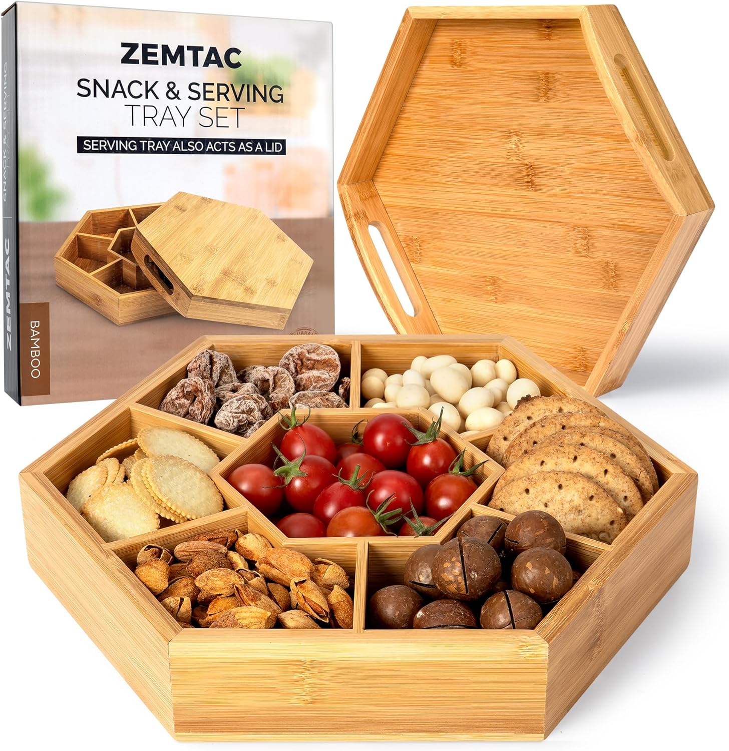 Snack Tray with Lid That Doubles as a Serving Tray – 13"x11" Bamboo Wooden Dry Fruit Tray for Nuts & Candy, Decorative Trays for Home Decor, Coffee Table or Ottoman Use (Bamboo, 13"x11")