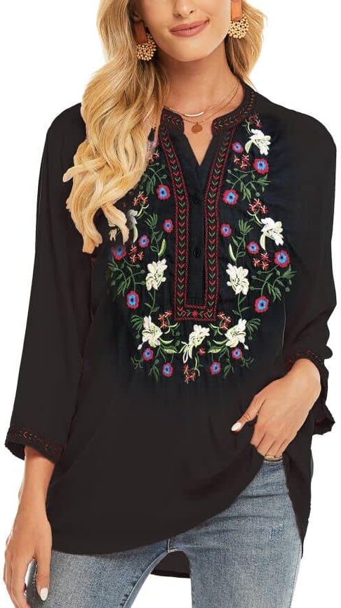 LauraKlein Women's Mexican Embroidered Tops Bohemian Clothes 3/4 Sleeve V Neck Boho Shirts Peasant Tunics Blouses