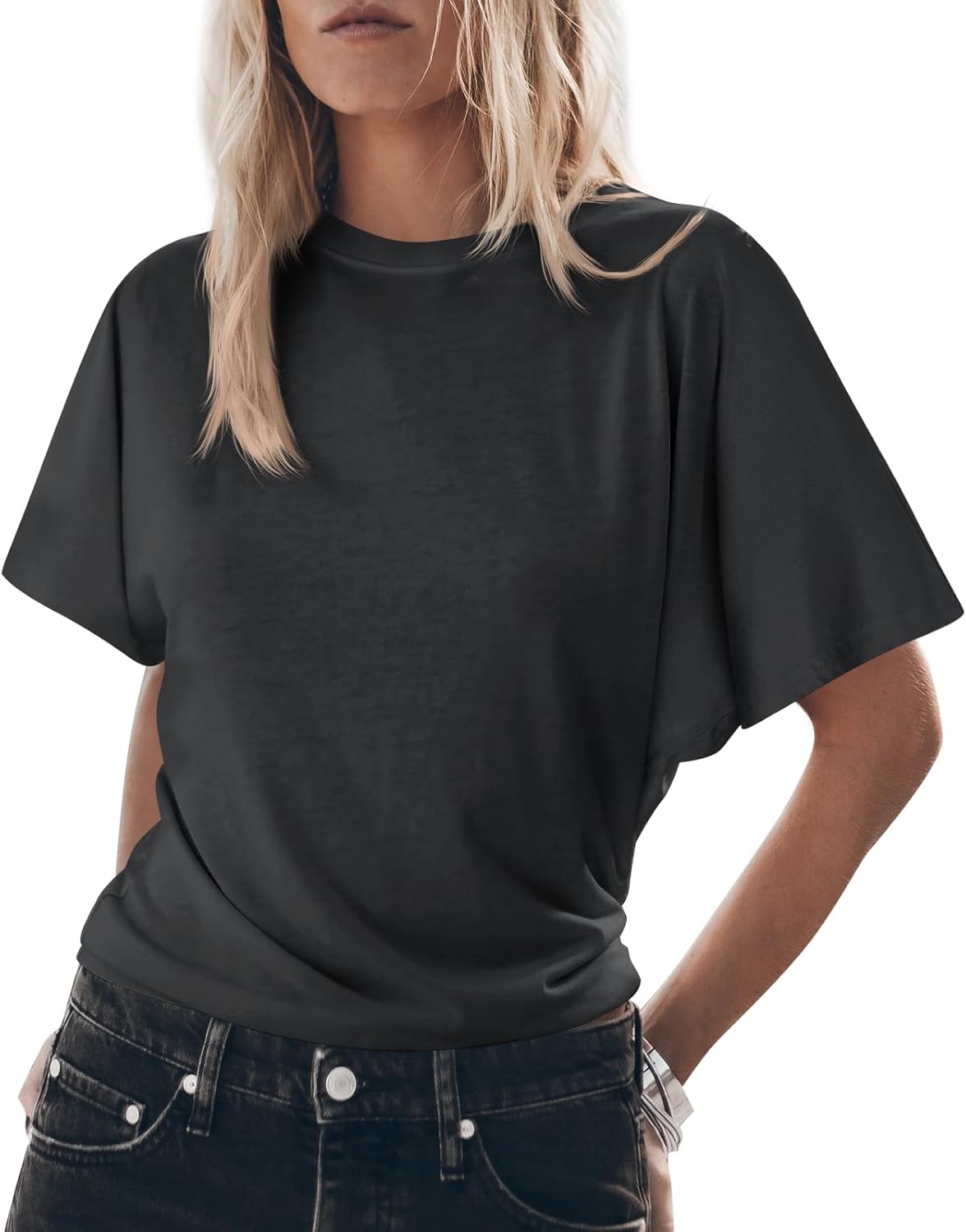 Tankaneo Womens Batwing Short Sleeve T Shirts Summer Casual Flowy Crew Neck Tops Loose Fit Boxy Basic Tees