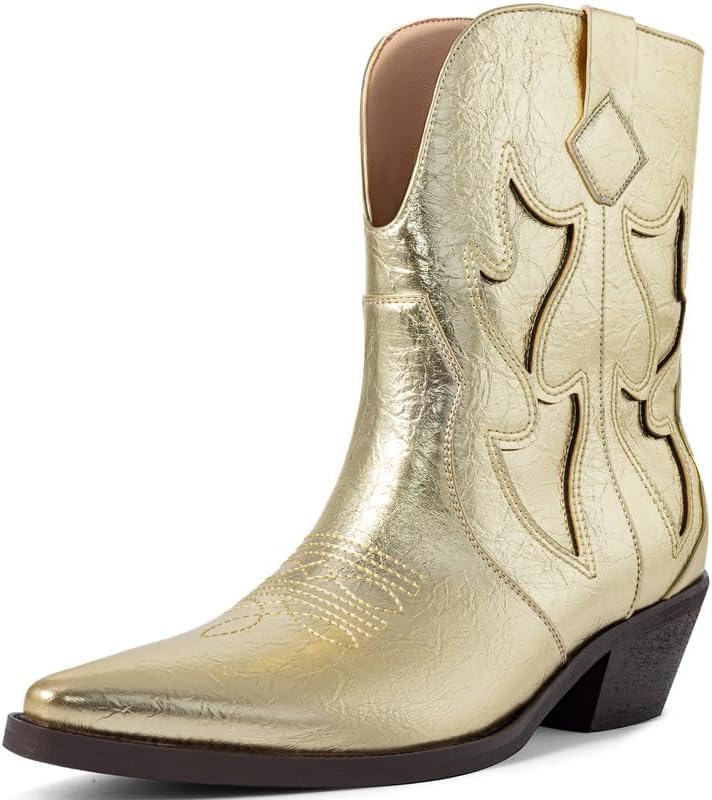 Cowboy Boots for Women Pointed Toe Pull On Boots Metallic Embroidered Western Cowgirl Boots with Chunky Heel for Wide Calf