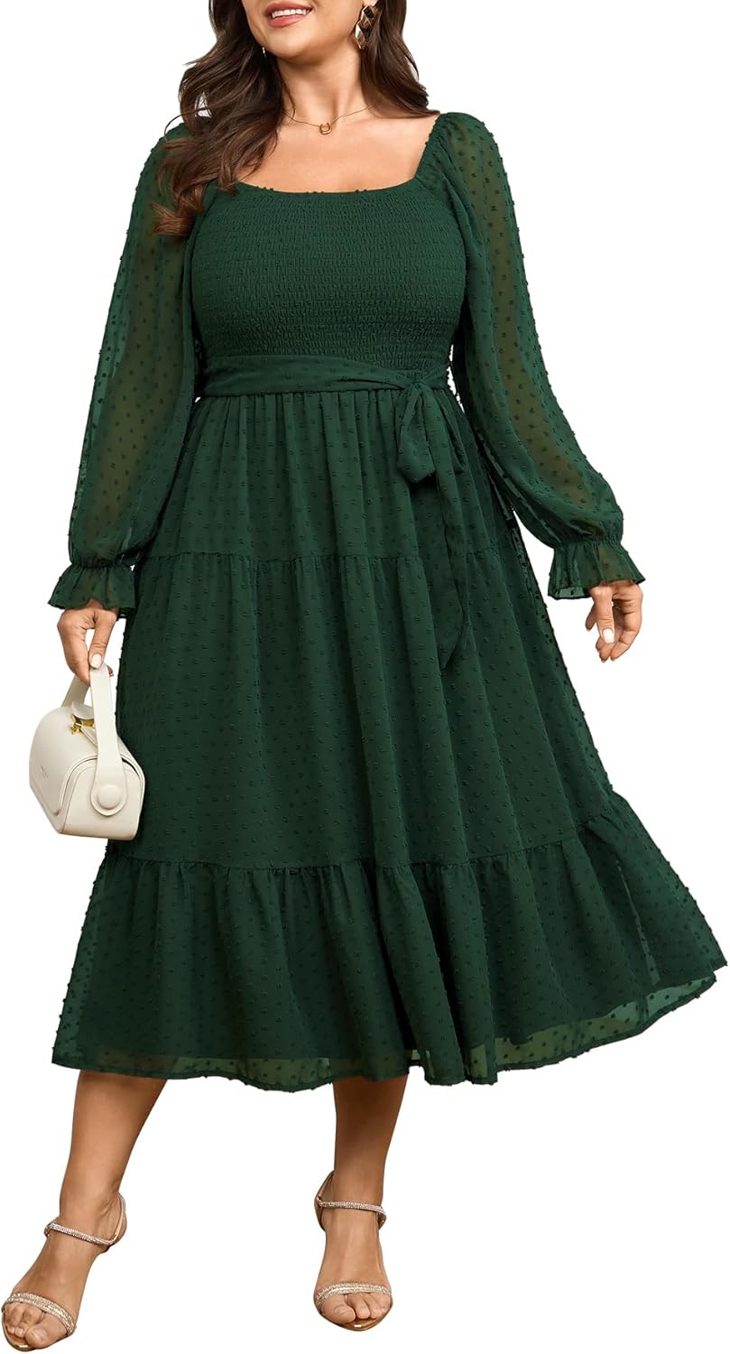 SCOMCHIC Women's Plus Size Dress Long Sleeve Square Neck Swiss Dot Chiffon Smocked A Line Ruffle Cocktail Maxi Dresses