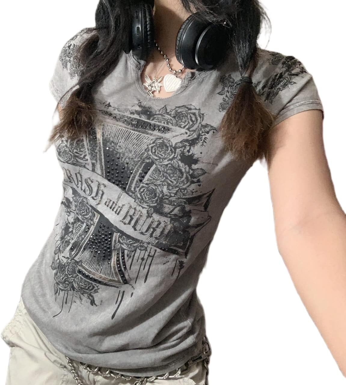 Womens E-Girls Short Sleeve Crop Top Fairy Grunge Graphic Print T-Shirts Gothic Basic Tee Y2K Aesthetic Tops Streetwear