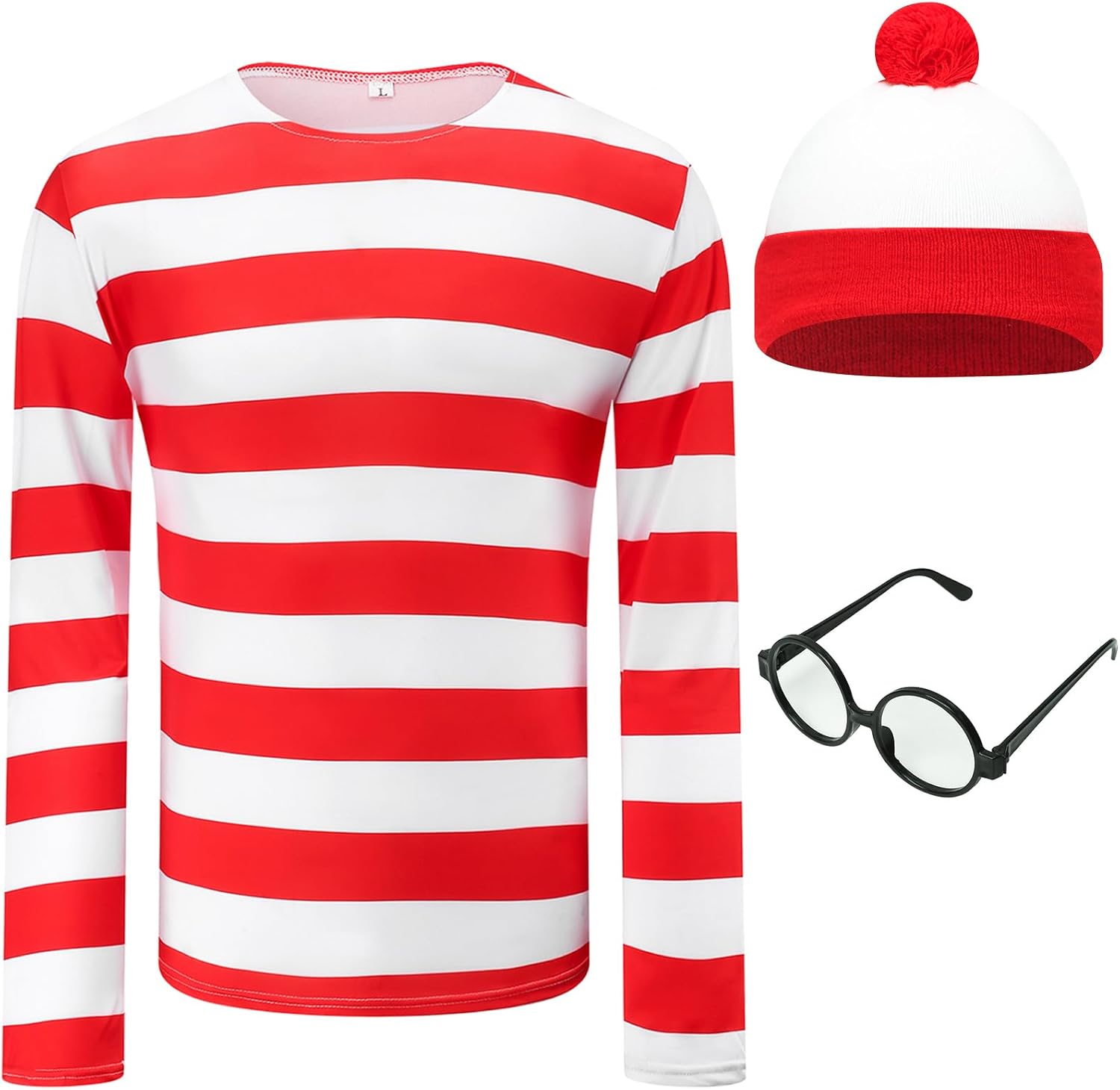Adult Men Red and White Striped Tee Shirt Glasses Hat Outfit Suit Set, Halloween Cosplay Sweatshirt Eyewear Costume