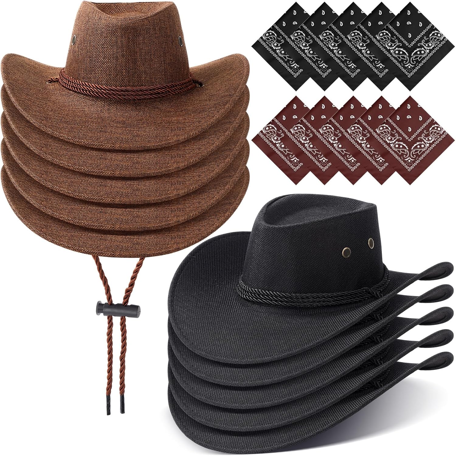 Coume 10 Set Cowboy Hat and Bandana for Women Men 10 Felt Cowgirl Cowboy Hat Bulk 10 Western Bandanas for Adult Costume Party