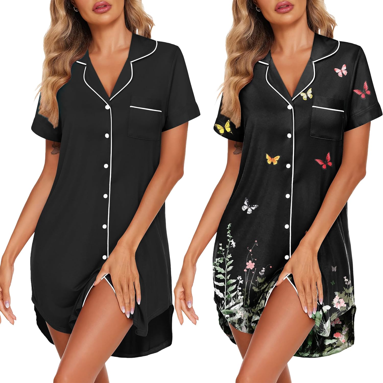 Ekouaer 2 Pack Nightgowns for Women Button Down Sleepshirts Short Sleeve Sleepwear V Neck Nightshirt Pajama Dress