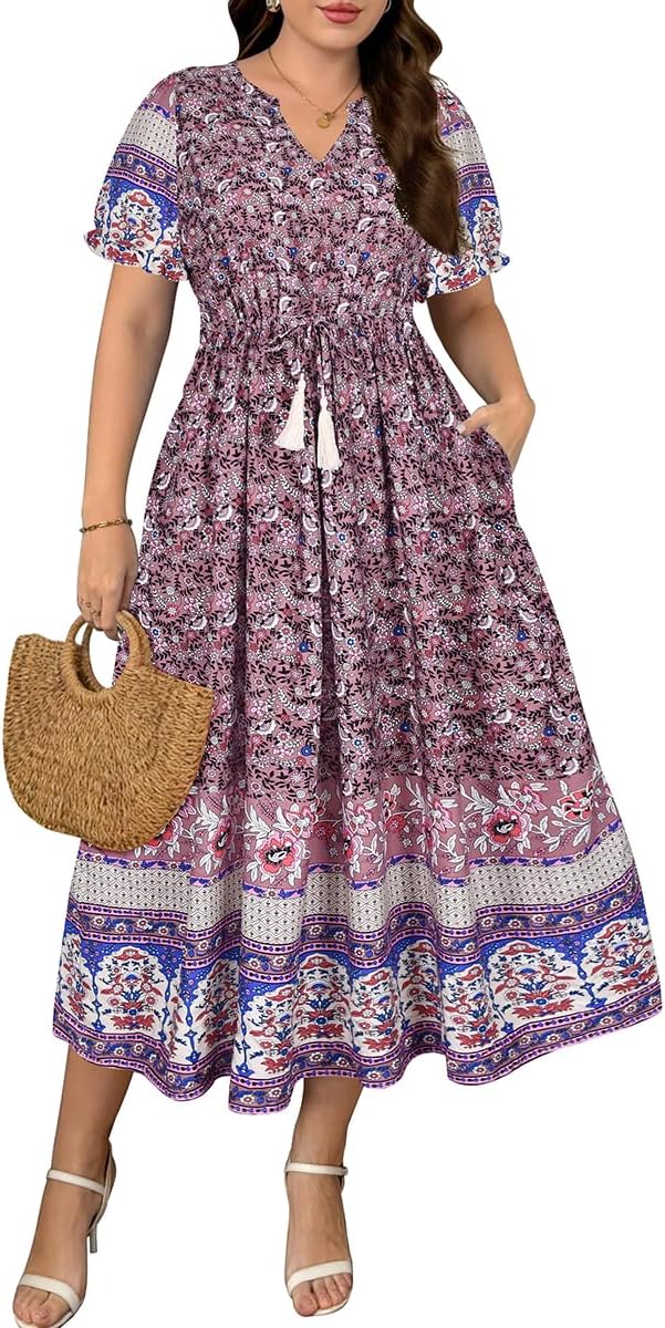RITERA Plus Size Midi Dress for Women Casual V NeckShort Sleeve Ruffle Flowy Boho Drawstring Tassel Waist XL-5XL