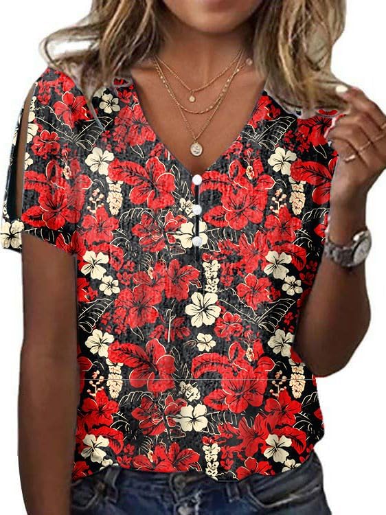 Boho Tops for Women Flower Print Fashion Summer Short Sleeve Tshirt Cute Casual Loose Fit Cold Shoulder Shirt Blouse