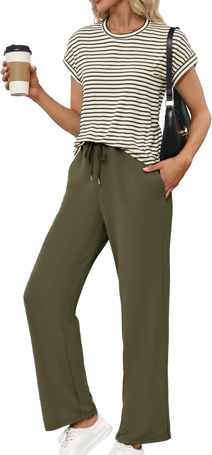 Glamaker Women's 2 Piece Sets Striped Summer Outfits Short Sleeve Shirts Wide Leg Pants Casual Lounge Sweatsuits