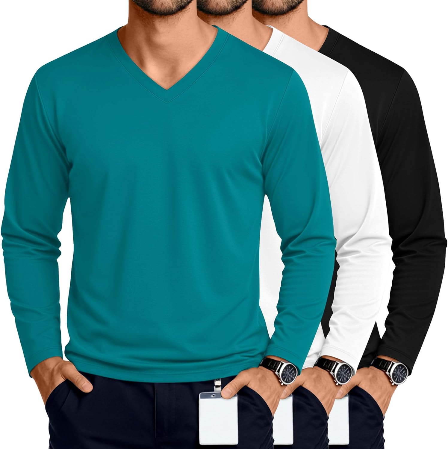 3 Pack Men's Big and Tall Undershirts Long Sleeve V Neck Shirts Base Layer Comfort Basic Tops Under Scrubs