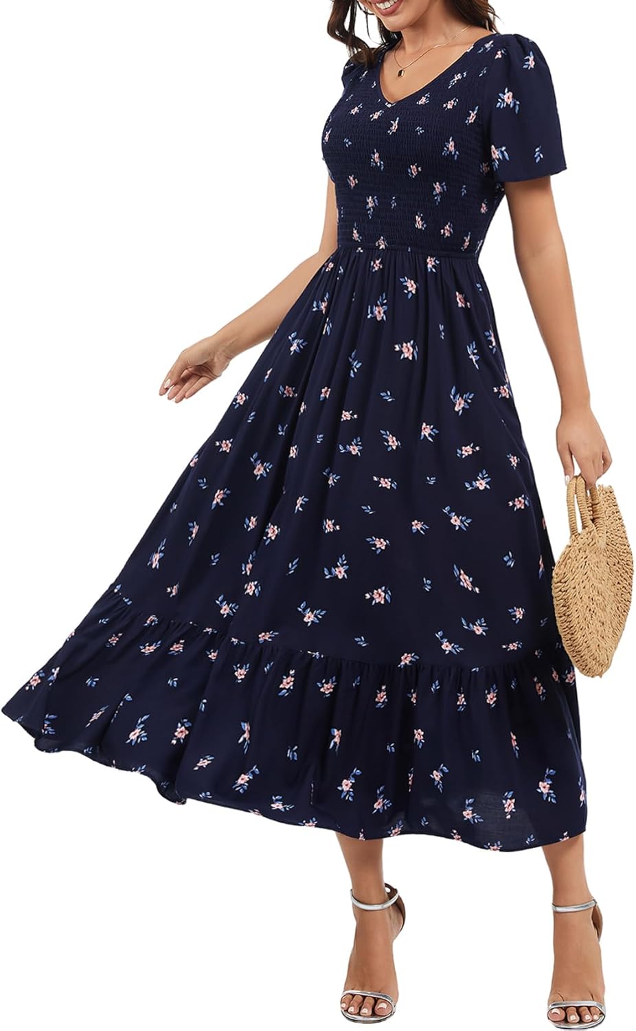 Vogebund Women's Summer V Neck Flowy Maxi Dress Casual Short Sleeve V Neck Smocked Beach Boho Dresses with Pockets