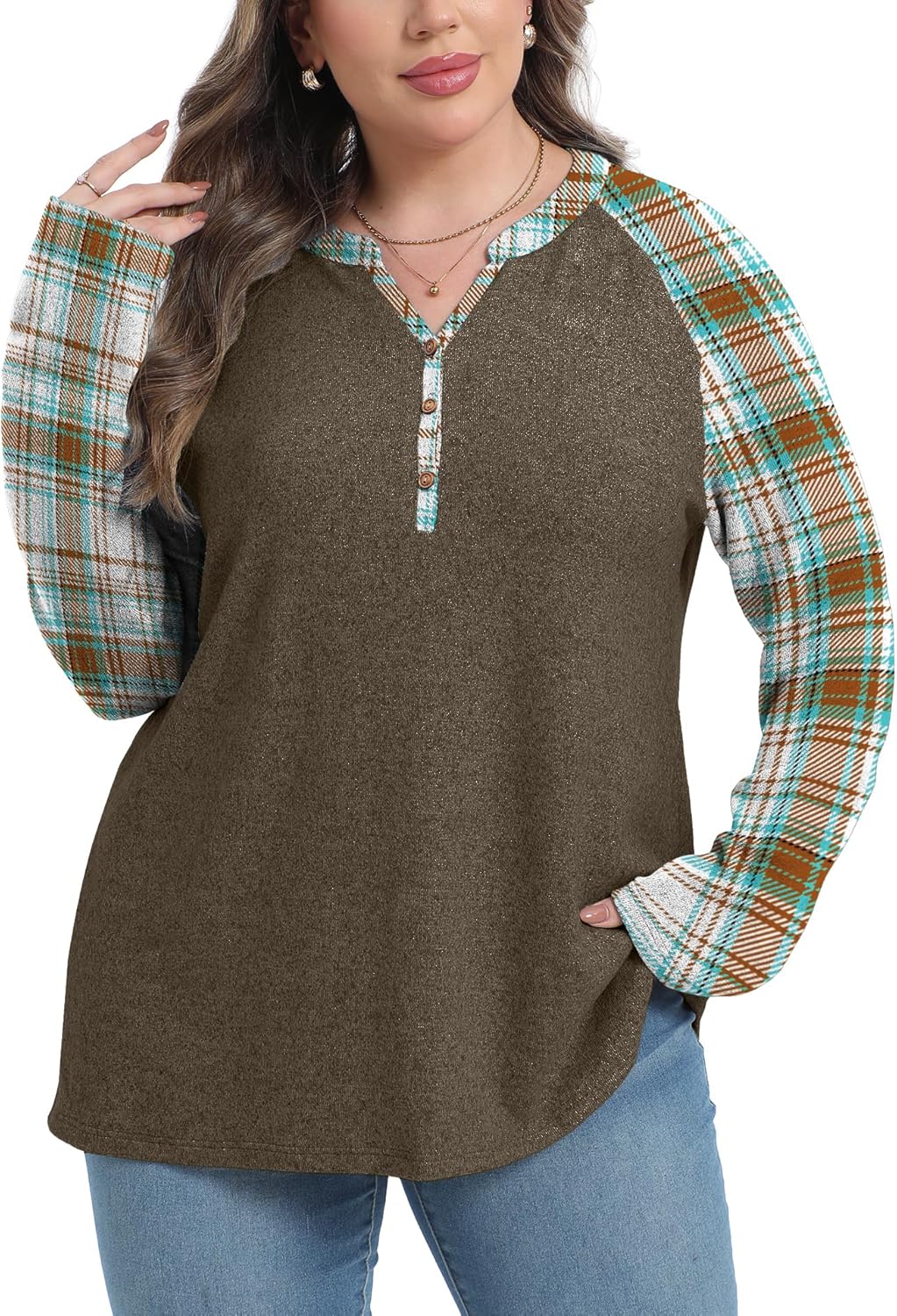 OLRIK Plus Size Tops for Women 2025 Fall Plaid Long Sleeve Henley Shirts Casual V Neck Button Tunic Tops