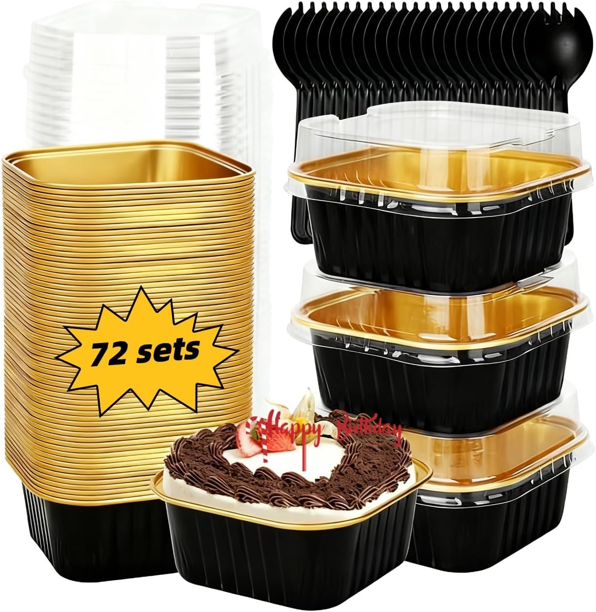 - Great Value Pack: This set includes 72 pcs of mini cake pans with lids, 72 clear snap-on covers, and 72 disposable spoons — a complete kit for baking, storing, and serving. Perfect for individual desserts, food gifts, and sample treats at parties or events.