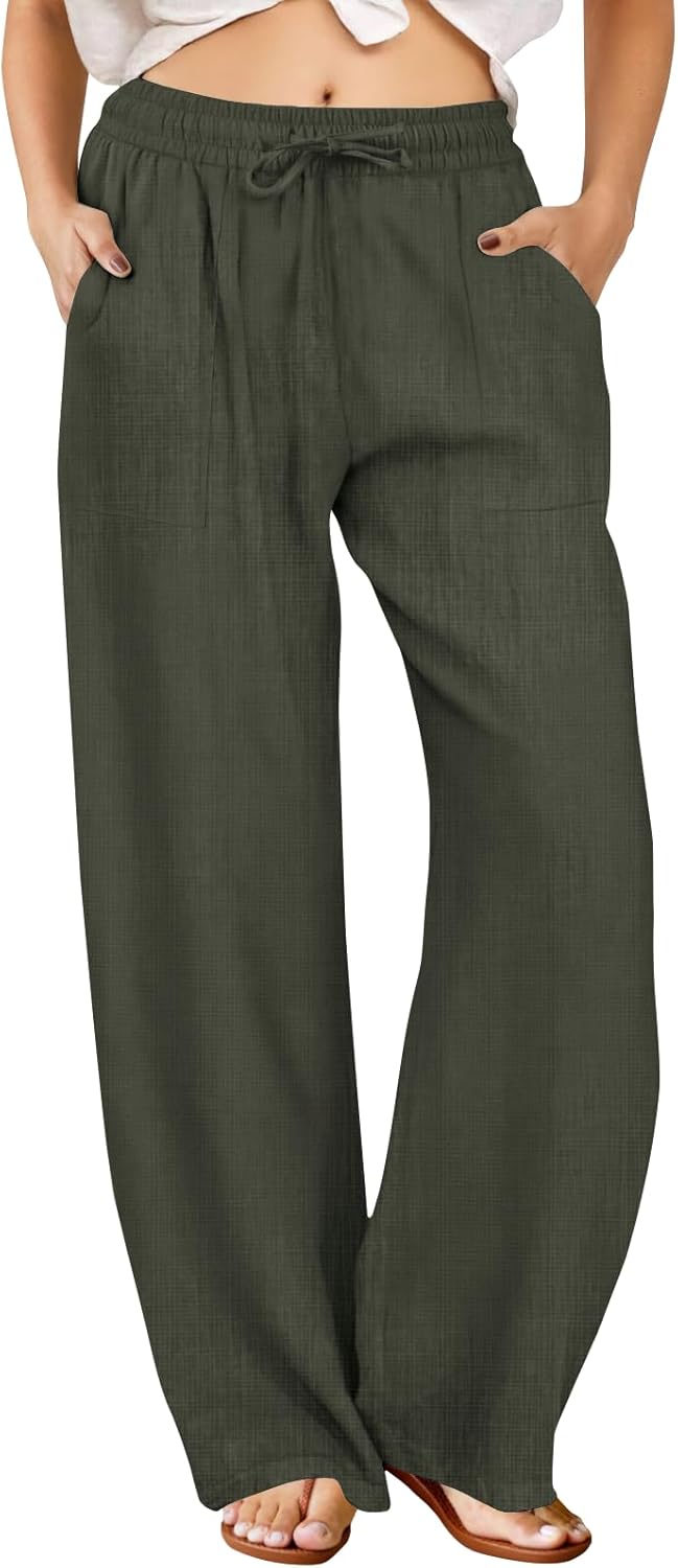 FireSwan Womens Palazzo Pants Casual Drawstring Flowy Pants Wide Leg Summer Beach Linen Trousers with Pockets
