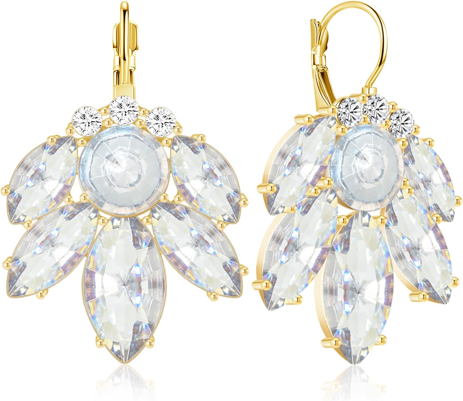 GPASTG Aesthetic Dainty Gold Sparkly Crystal Rhinestone Leaf Flower Dangle Drop Leverback Earrings For Women