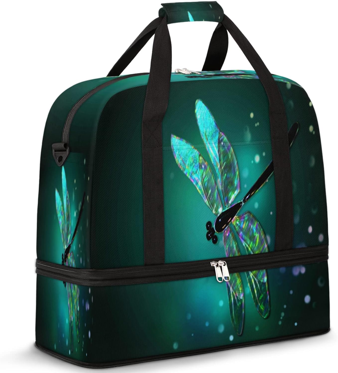Glass Dragonfly Green Foldable Travel Duffel Bag Tote, Abstract Dragonfly Lightweight Luggage Sports Gym Bag with Shoes Compartment Weekender Overnight Bag for Women & Men