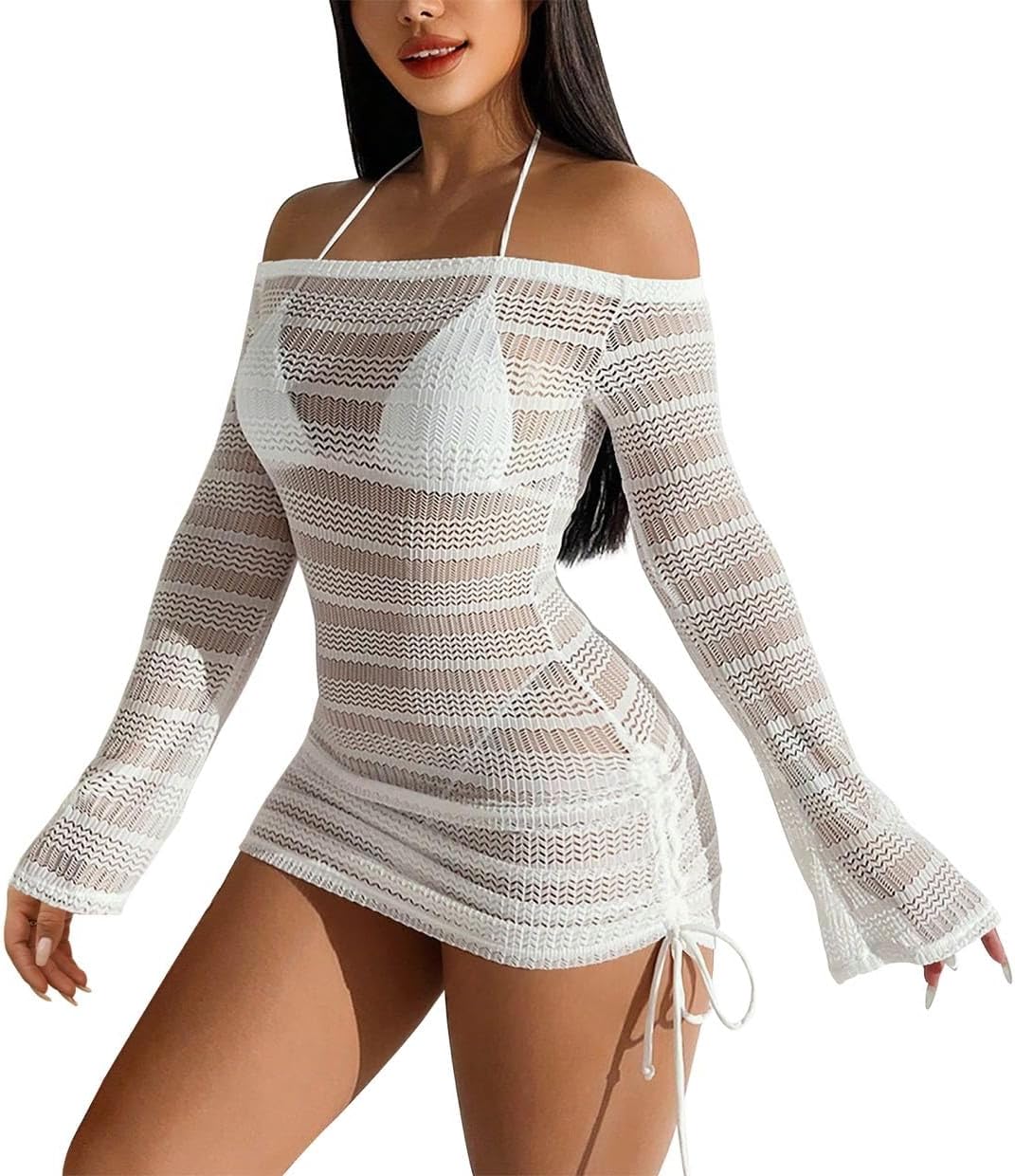 Summer Women's Sexy Mesh Hollow Out Off Shoulder Bathing Suit Coverups Long Bell Sleeve Ruched Drawstring Swimsuit