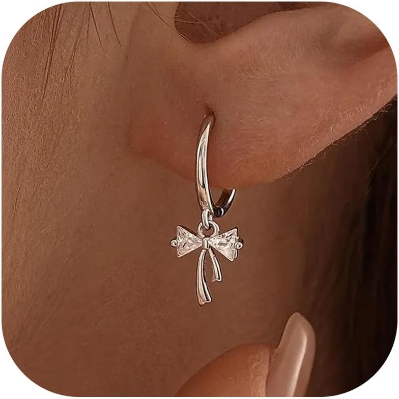 Bow Earrings for Women Ribbon Dangle Drop Gold Silver Hoop Cute Simple Dainty Statement Rhinestone Crystal Cubic Zirconia Jewelry Gifts
