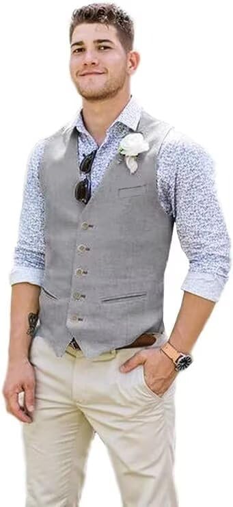 Bofan Men Suit Vest Linen Grey Beach Wedding Waistcoat Summer Casual Vest For Men Groomsmen Dress XXXL