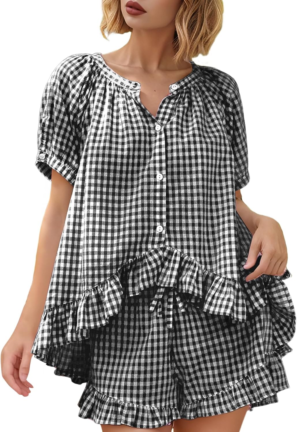 Yimoon Womens Gingham Pajamas Set Plaid Cotton Pj Set Puff Sleeve Ruffle Babydoll Shirt Shorts Summer 2 Piece Outfits