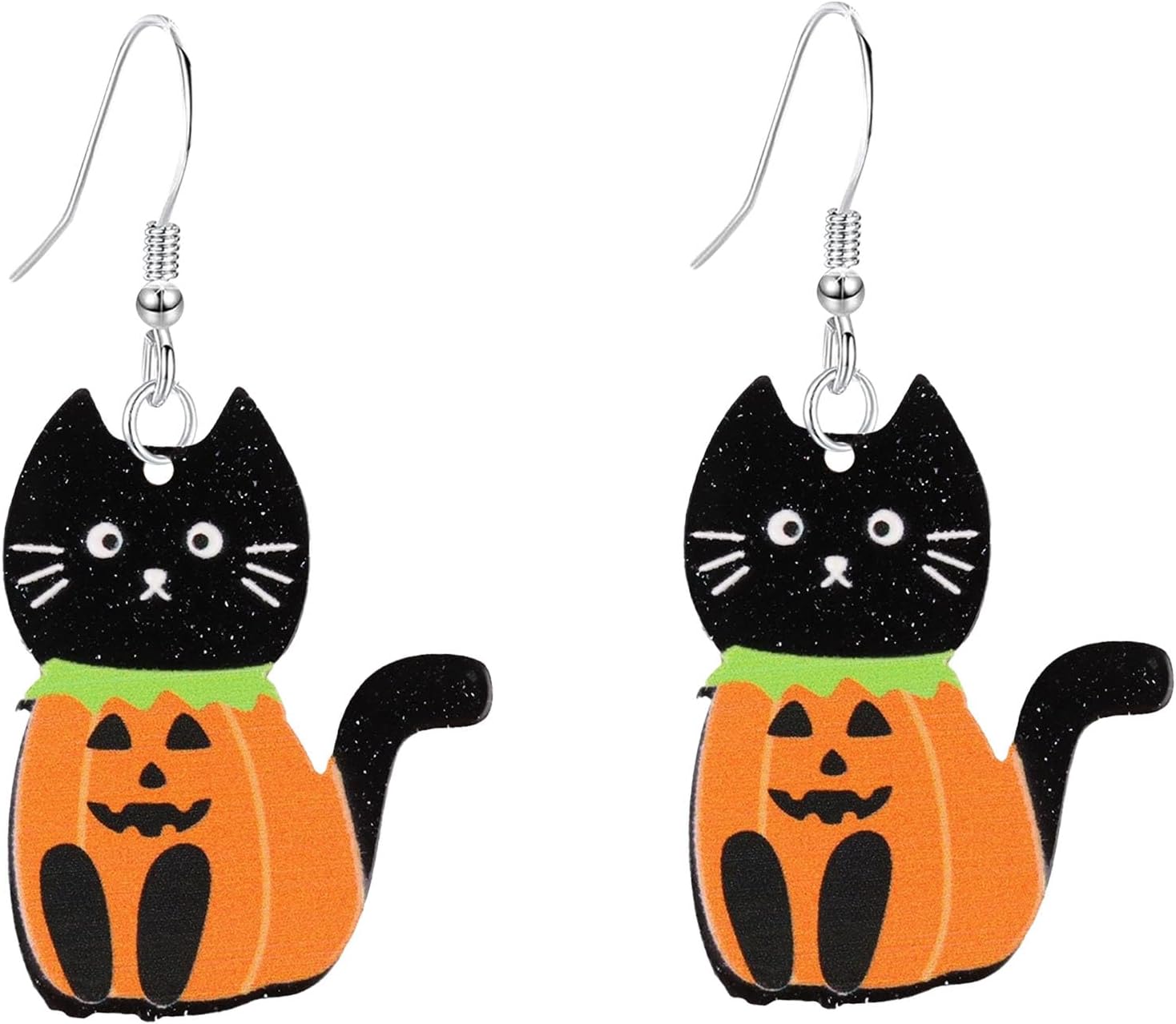 Halloween Acrylic Pumpkin Earrings Cute Cartoon Cat Printed Dangle Earrings for Women Lightweight Spooky Party Costume Jewelry