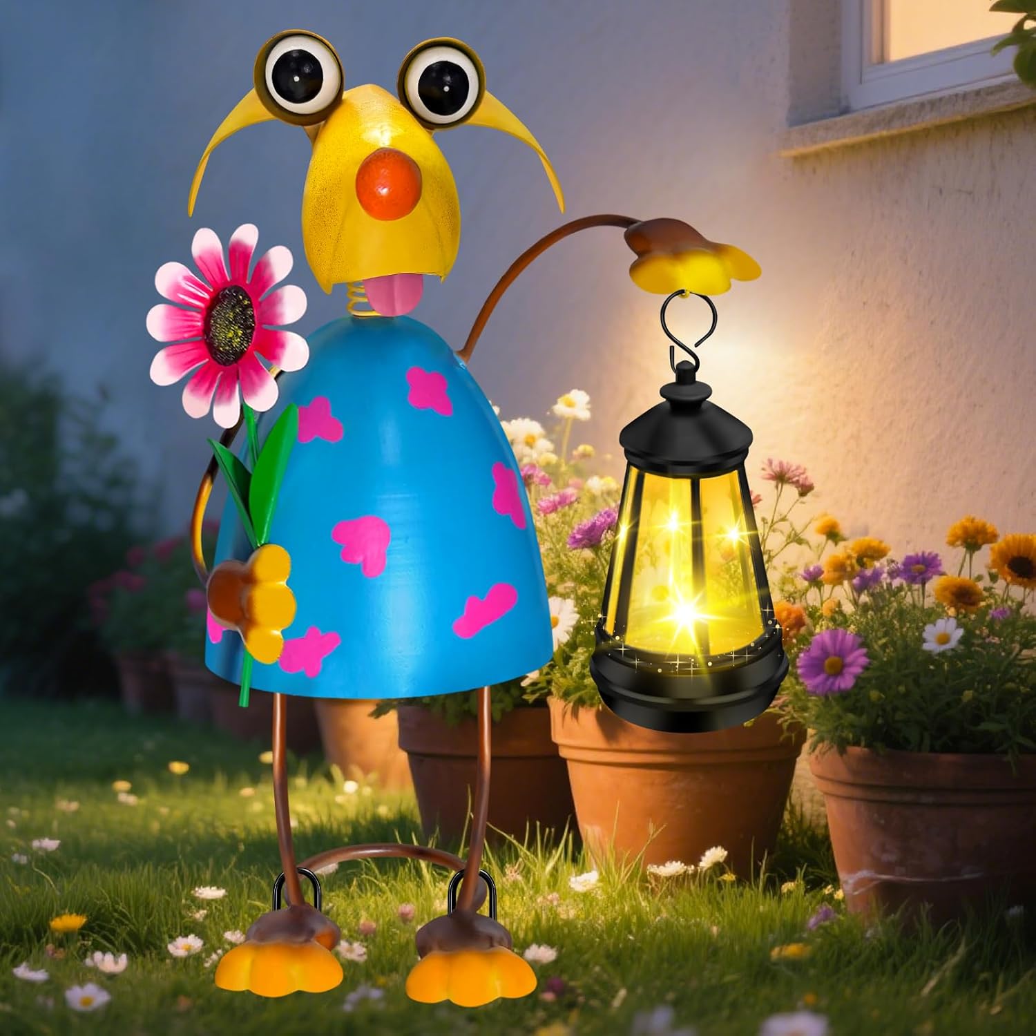 - 【2025 Newest Whimsical Dog Garden Statue】: dog statues outdoor with Lantern lights is a cute and whimsical garden decorations outdoor,garden statues for outside made of metal and standing 13.38 inches tall,this adorable dog statue holds a 6.3-inch tall solar lamp in its hand and is brightly colored to make it a delightful additions to any outdoor and garden. Let this lucky dog protect your garden and become a welcome sign in your yard,he dispels the darkness of the night and lights the way.