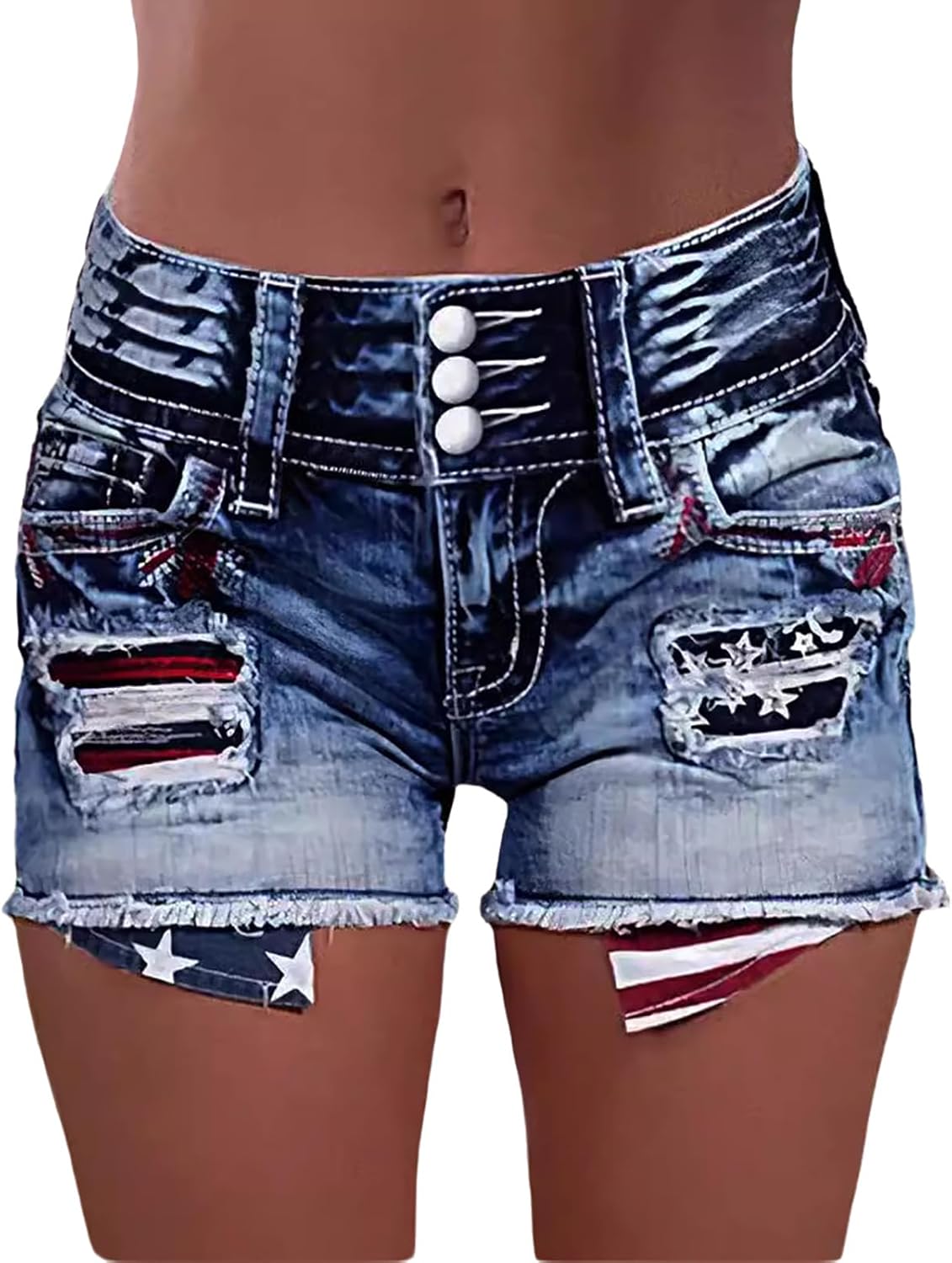 Women's Ripped High Waisted Jean Shorts American Flag Frayed Raw Hem Casual Denim Shorts